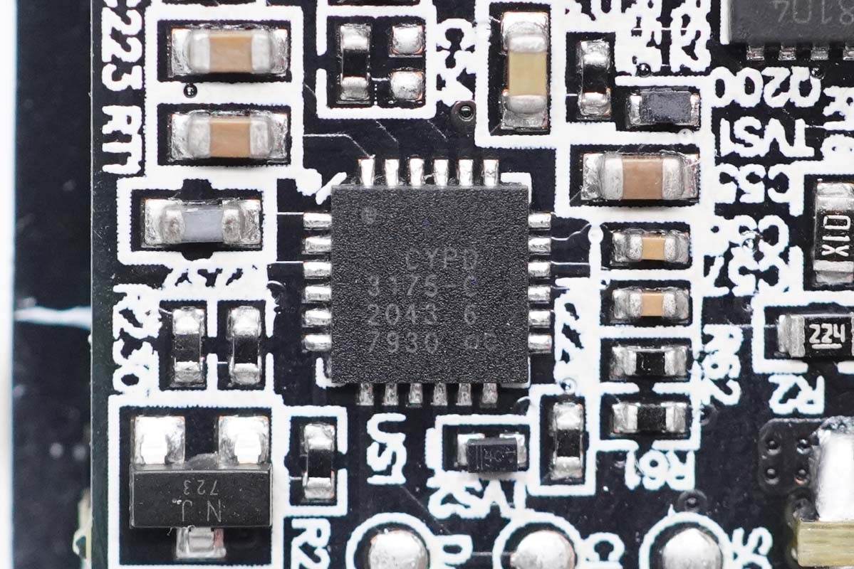 USB PD協議芯片采用賽普拉斯CYPD3175。這款芯片支持1A1C接口,支持QC4.0和其他快充協議,集成次級反饋和輸出電流檢測放大器,內置多重完善的系統級保護,內置32位MCU,內置時鐘,支持3-24.5V寬泛的工作電壓范圍,左側是熱敏電阻,用于檢測適配器溫度,進行溫度保護。