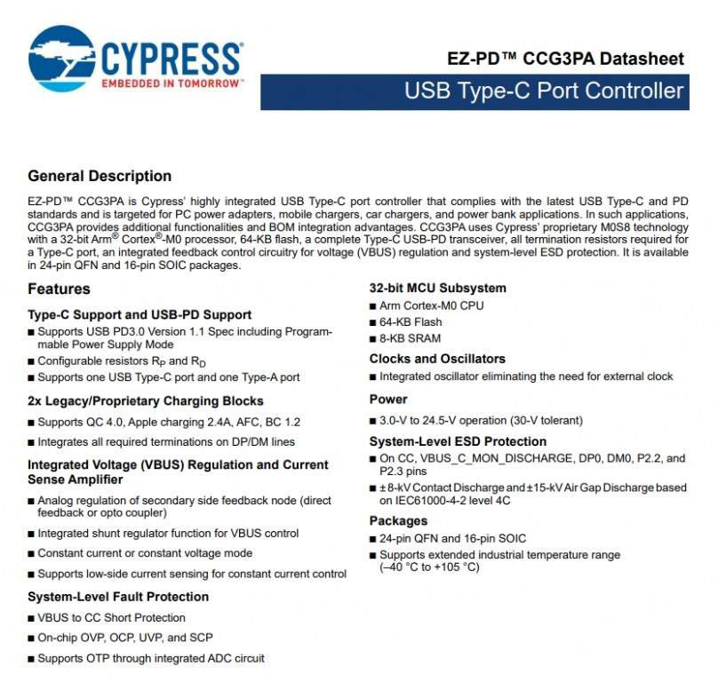 充電頭網了解到,CYPD3175是一顆通過了協會USB PD3.0(PPS)認證的芯片,此前已被安克60W 1A1C氮化鎵充電器、安克Nano?20W和18W快充充電器、Anker?PowerCore Fusion PD超級充、安克65W氮化鎵4口桌面PD快充充電器等產品采用。同時,賽普拉斯的快充協議芯片還可用于USB PD快充車充、移動電源等領域,并被數十款電源產品采用。