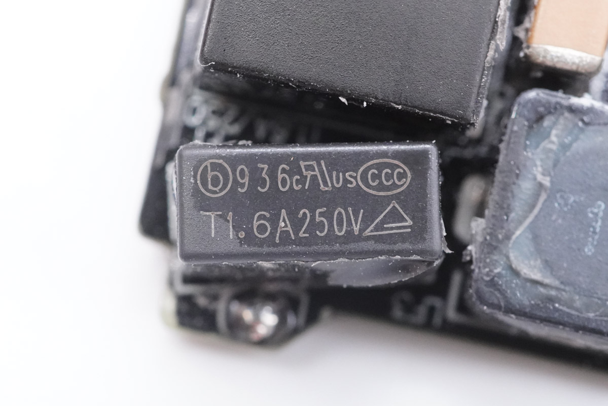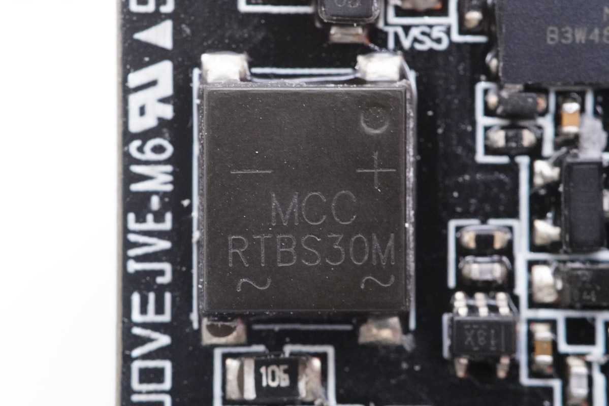PCB板背面一覽。通過觀察發現,這款充電器采用典型的開關電源寬范圍輸出,由協議芯片控制輸出電壓的架構。下面我們就從輸入端開始了解各元器件的信息。