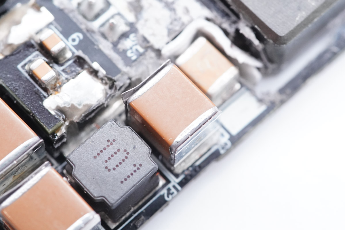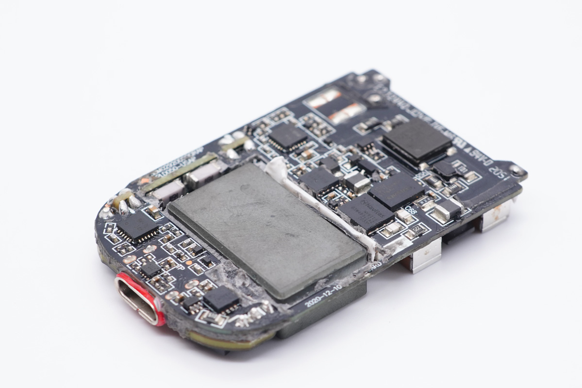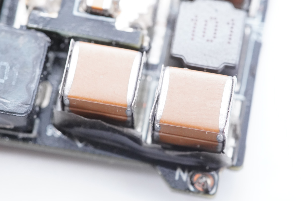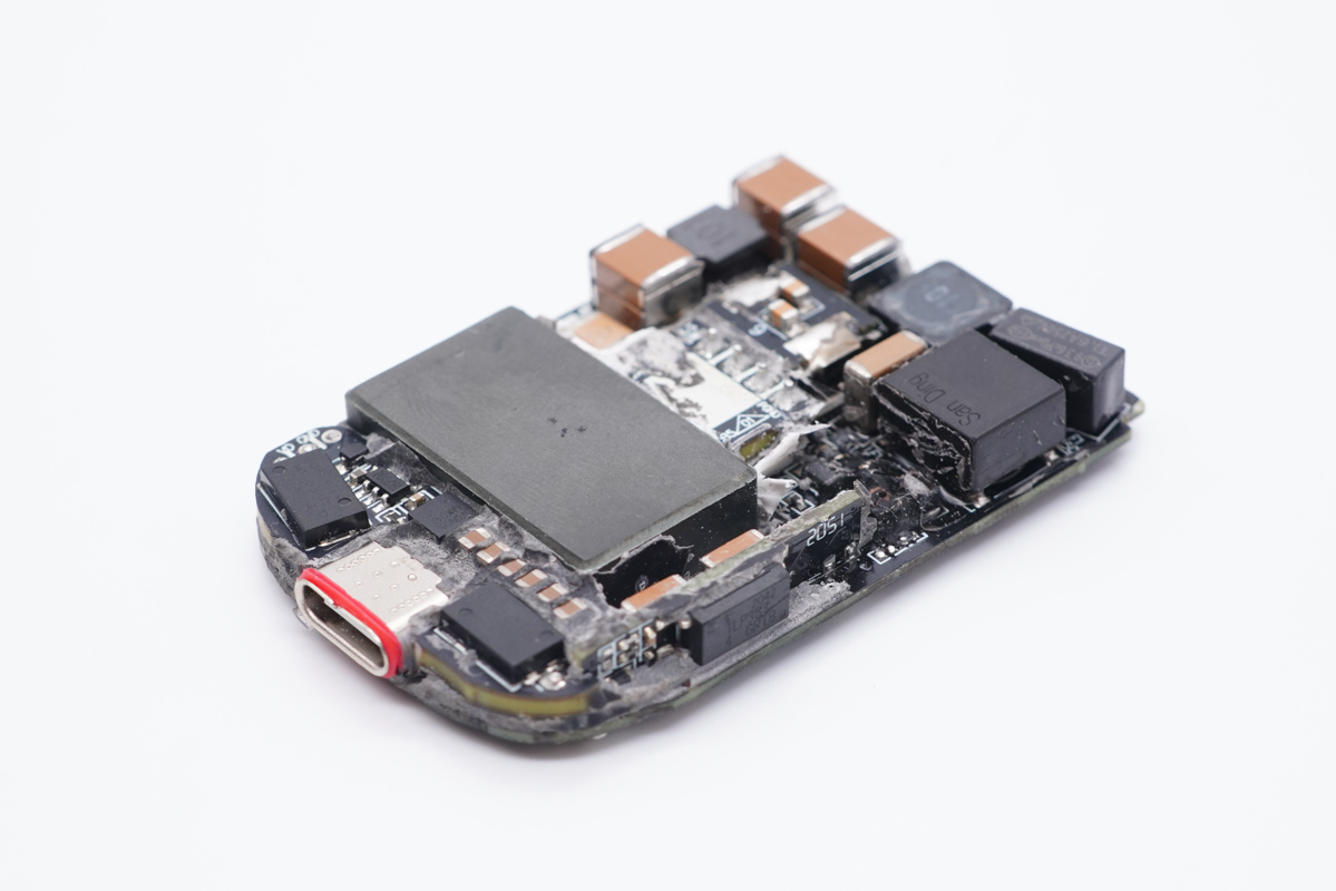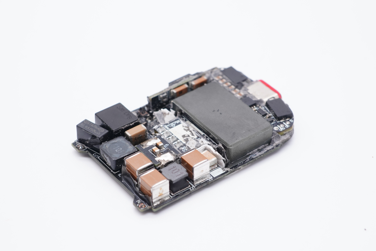 PCB板正面一覽,平面變壓器小板架在主板上,為追求極致超薄,主板對應變壓器區域鏤空處理,輸入端電容、電感等器件均采用貼片形式。