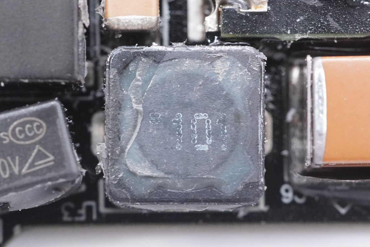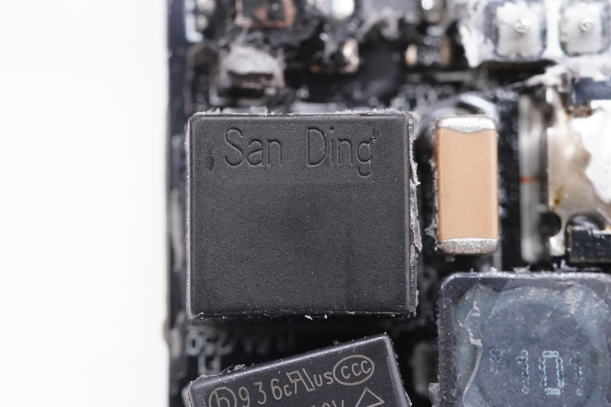 PCB板背面一覽,初級側貼有導熱墊,整流橋露出,平面變壓器沉板設計以降低機身厚度,此外包裹絕緣膠帶。