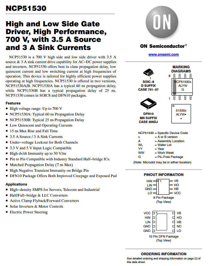 安森美 NCP51530B 高低側柵極驅動器,配合TI UCC28782,用于驅動ACF架構的兩個GaN開關管。