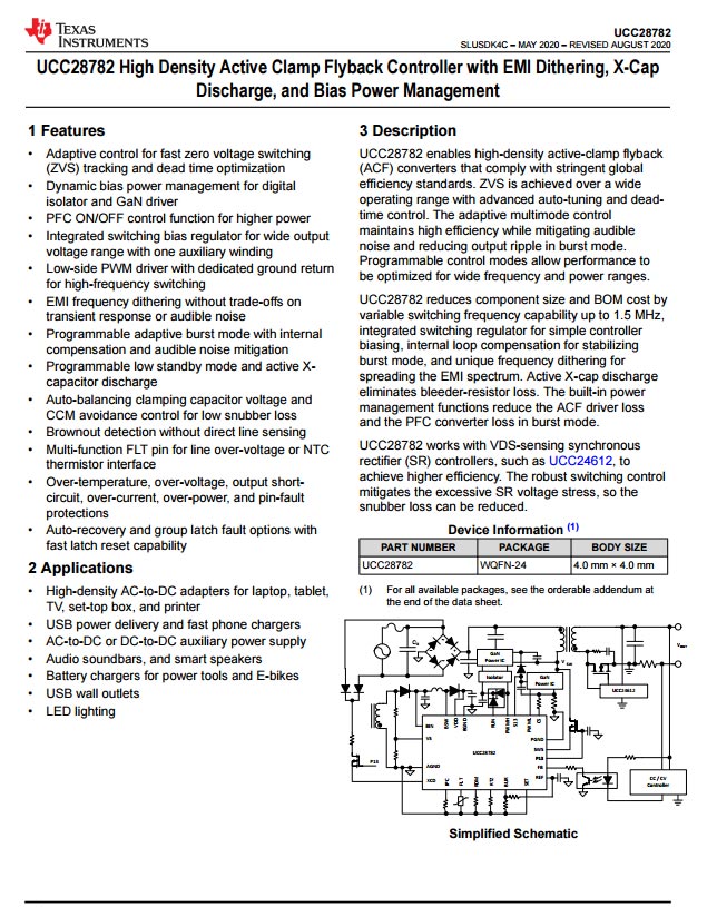 TI UCC28782高密度ACF控制器,支持頻率抖動以降低EMI電磁干擾,內置X電容放電和偏置電源管理。