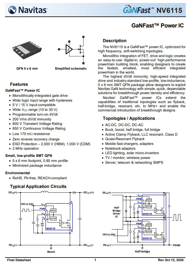納微半導體NV6115 GaN開關管,內置復雜的邏輯控制電路,170mΩ導阻,耐壓650V,支持2MHz開關頻率,采用5*6mm QFN封裝,節省面積。