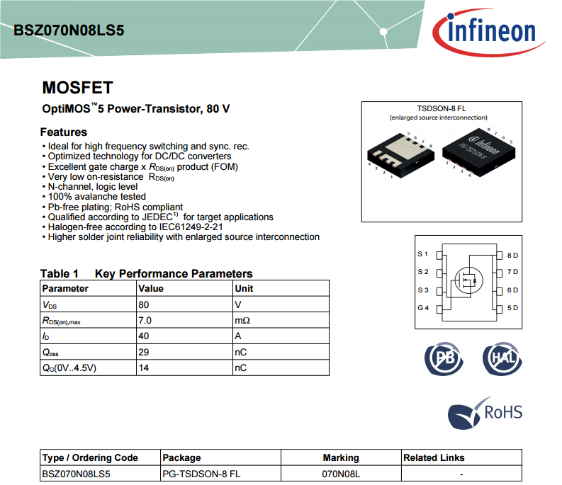 次級同步整流管采用英飛凌 BSZ070N08LS,NMOS,耐壓80V,導阻7mΩ。