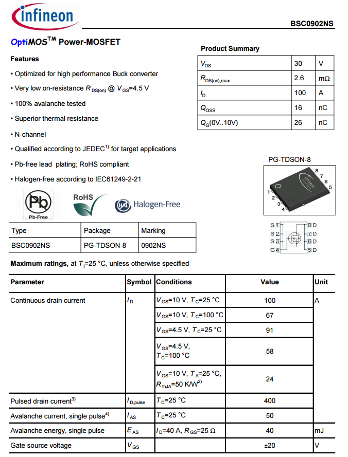 輸出VBUS開關管采用英飛凌BSC0902NS,NMOS管,耐壓30V,導阻2.6mΩ。