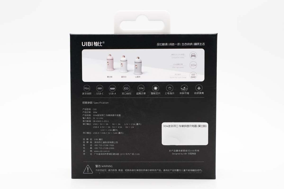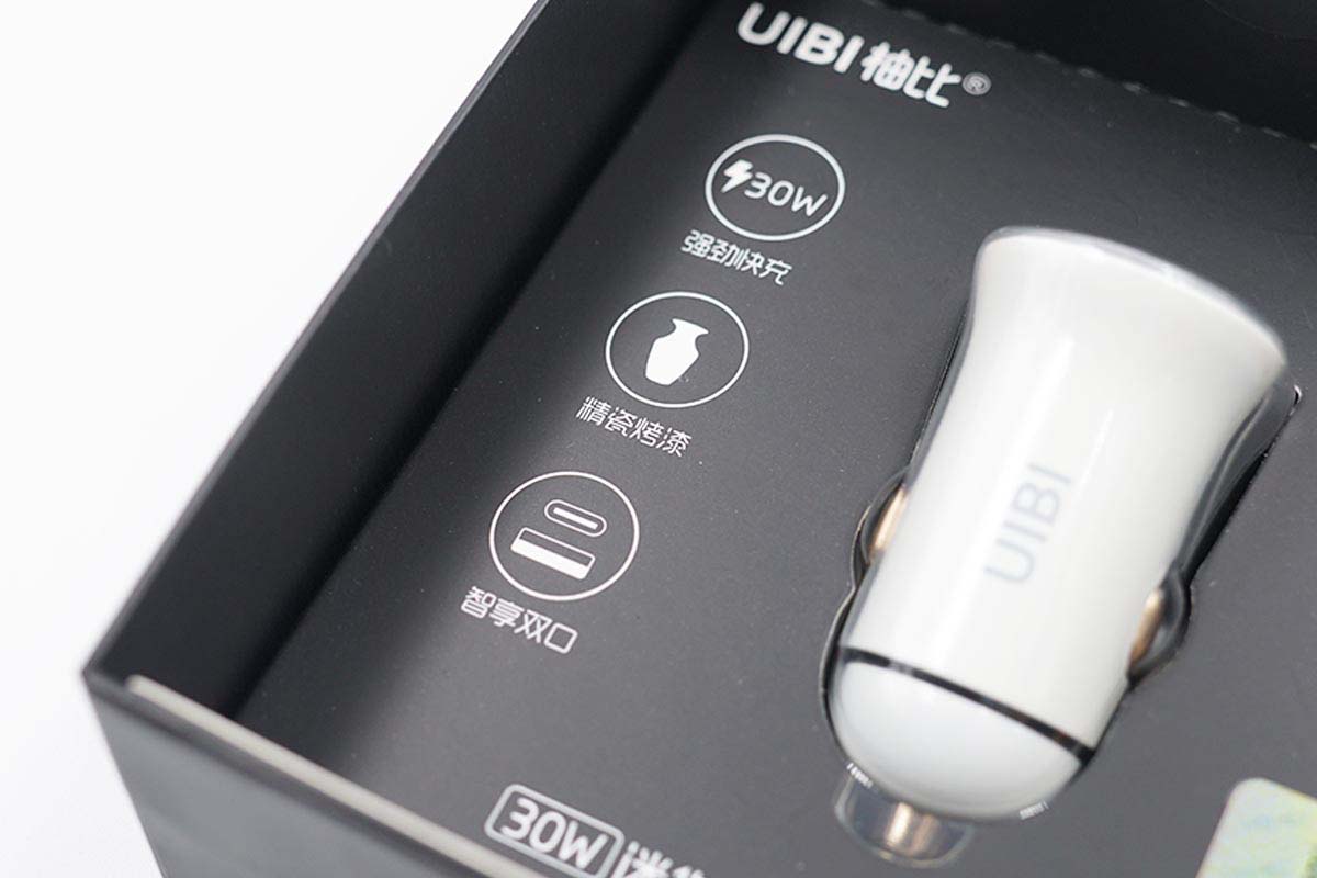 盒子一側(cè)印有UIBI柚比品牌以及30W快充、精瓷烤漆、USB接口三大特性標(biāo)識(shí)。