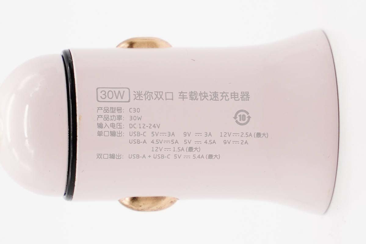 另一側(cè)貼有黃金版標(biāo)簽,下方是30W迷你雙口·車(chē)載快速充電器名稱(chēng)。