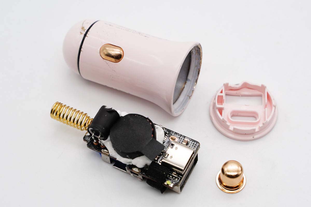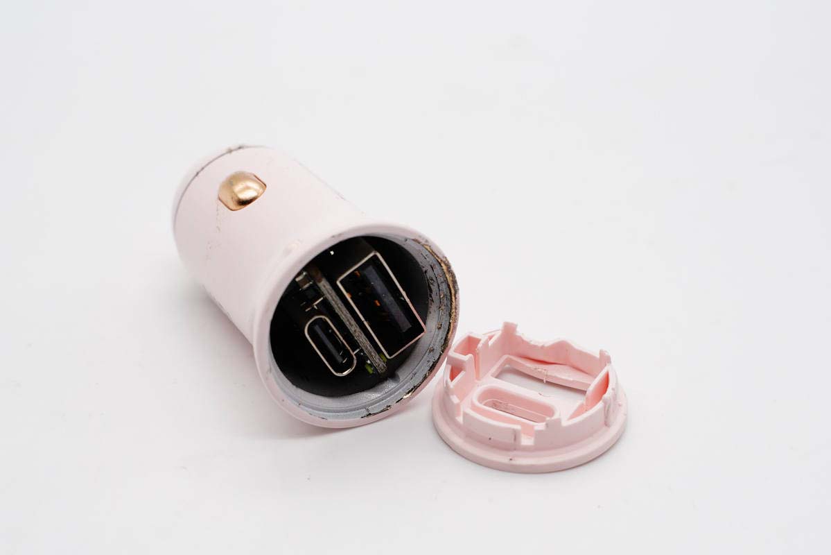 將車(chē)充頂部外殼拆開(kāi),卡扣封裝。