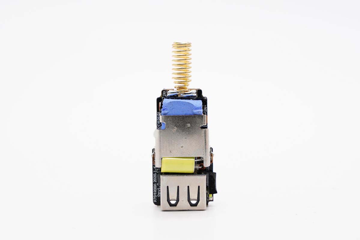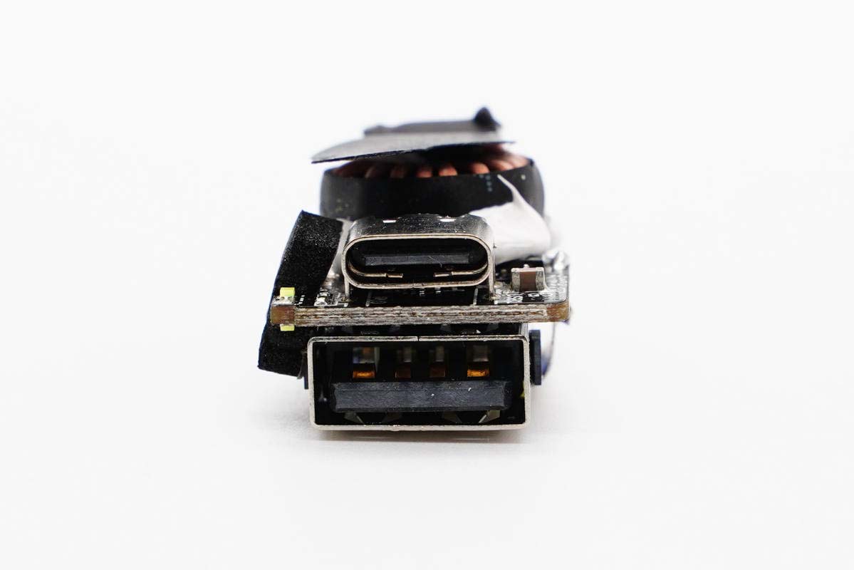 充電頭網(wǎng)通過(guò)拆解了解到,這款車(chē)充采用了智融SW3510快充解決方案,進(jìn)行輸入降壓和接口協(xié)議識(shí)別,控制1A1C接口輸出電壓,此外為芯片覆蓋導(dǎo)熱墊并配有散熱片。輸入輸出端配有鈺邦和萬(wàn)裕ULR系列固態(tài)電容進(jìn)行濾波,電容全部做了絕緣處理。產(chǎn)品整體用料扎實(shí),做工講究。