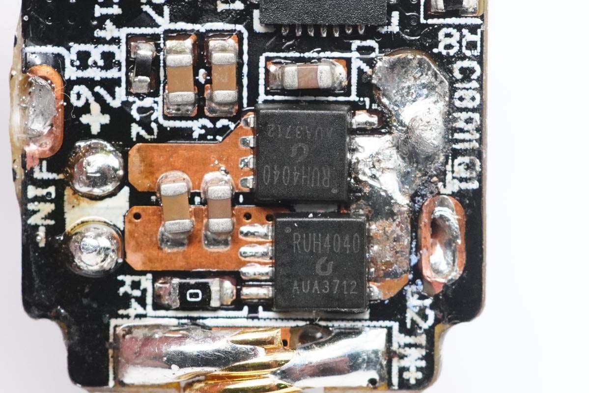 外掛兩顆銳駿RUH4040M2 MOS管為接口輸出同步整流降壓,NMOS,耐壓40V。