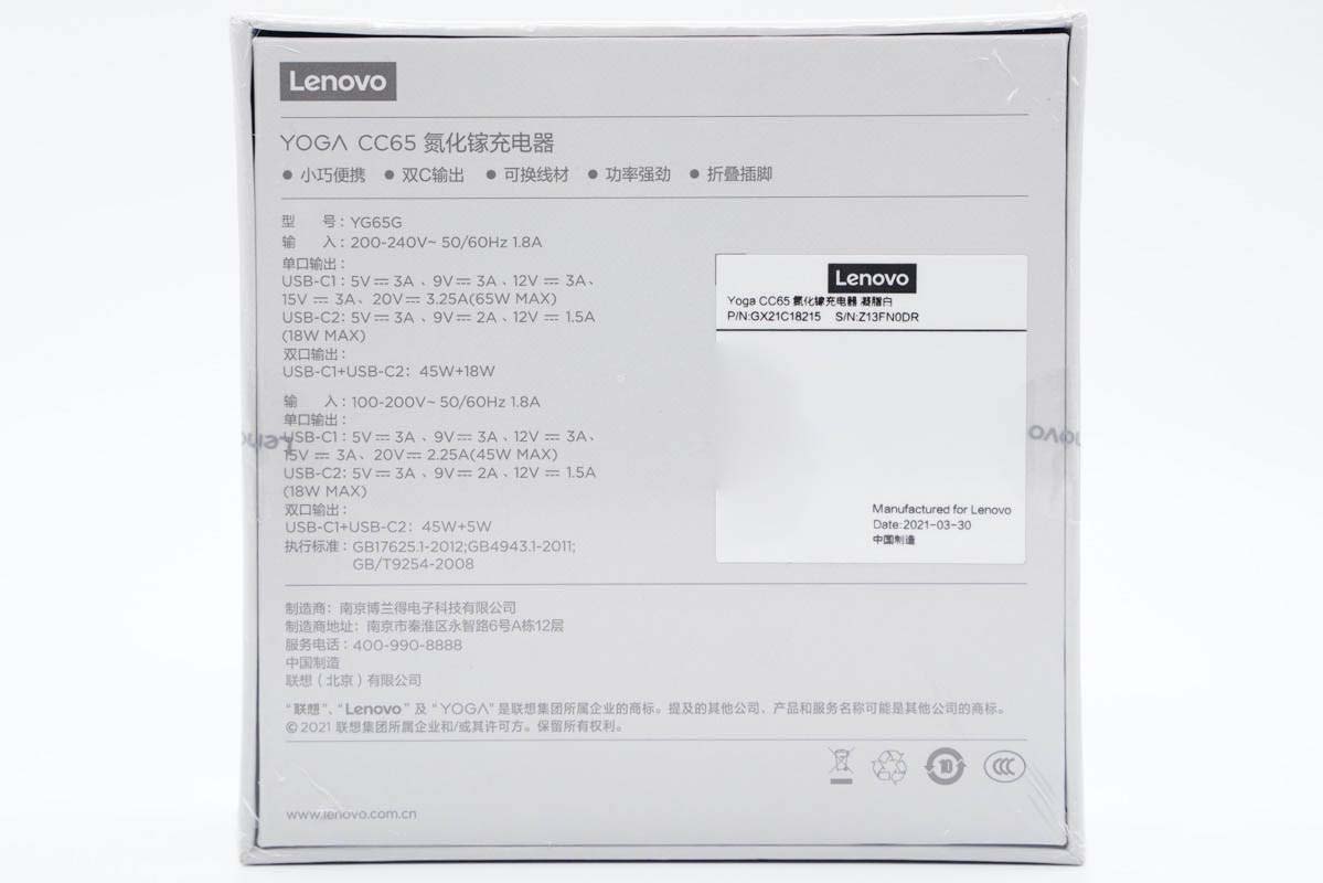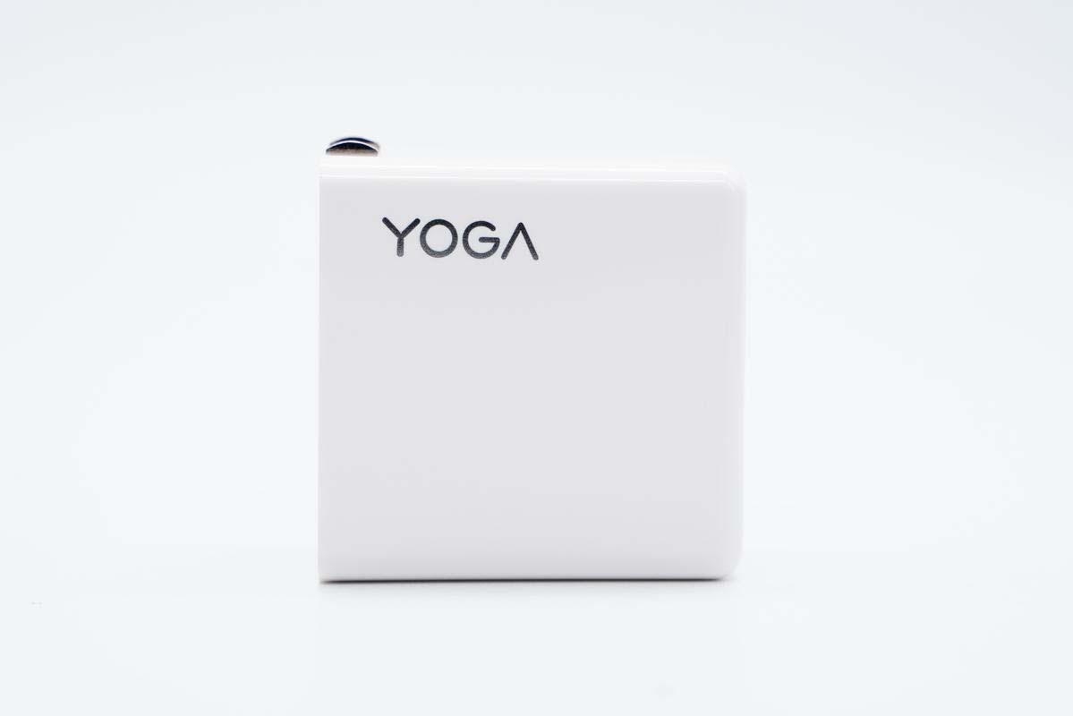 方形包裝盒設計簡約,頂面中心是充電器外觀圖,左上角是YOGA品牌和產品名稱,右下角設有Lenovo品牌。