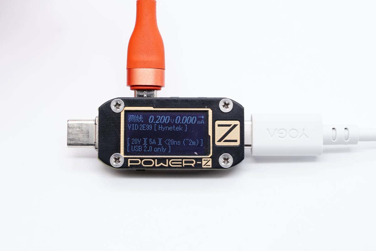 使用ChargerLAB POWER-Z KM001C檢測,顯示該線纜帶有E-Marker芯片,電力傳輸能力為20V5A,數據傳輸能力為USB 2.0。