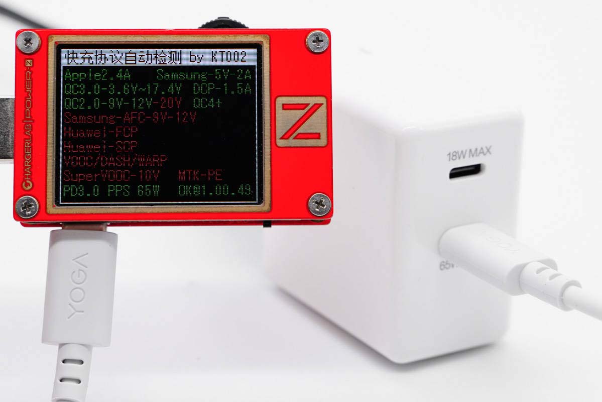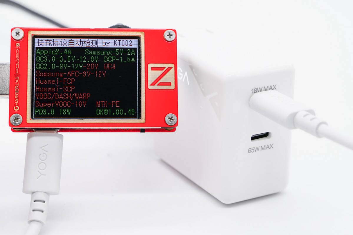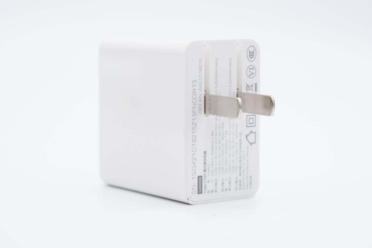 聯想YOGA CC65雙口氮化鎵充電器機身光滑簡潔,邊角圓潤,配備可折疊插腳和雙C輸出口,功率密度做到了0.88W/cm3,整體十分小巧。C1和C2口分別支持最大65W/45W和18W快充,視輸入電壓大小決定,支持QC、PD、PPS通用快充協議,支持45W+18W雙口同時快充策略,滿足筆電和手機同時快充需求。