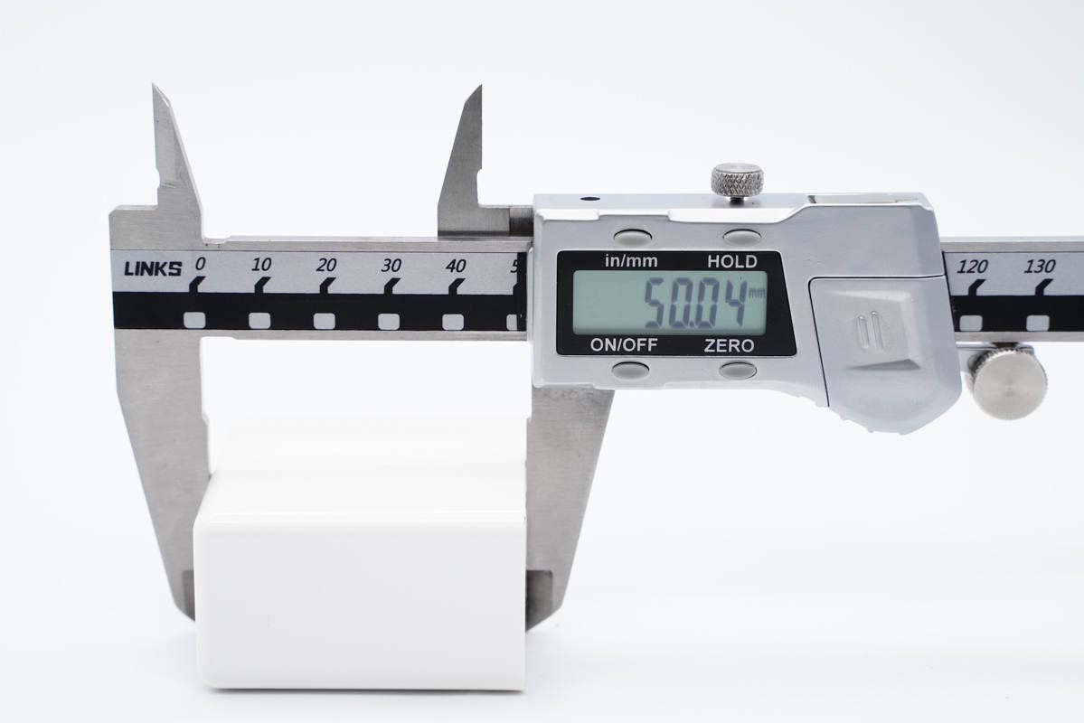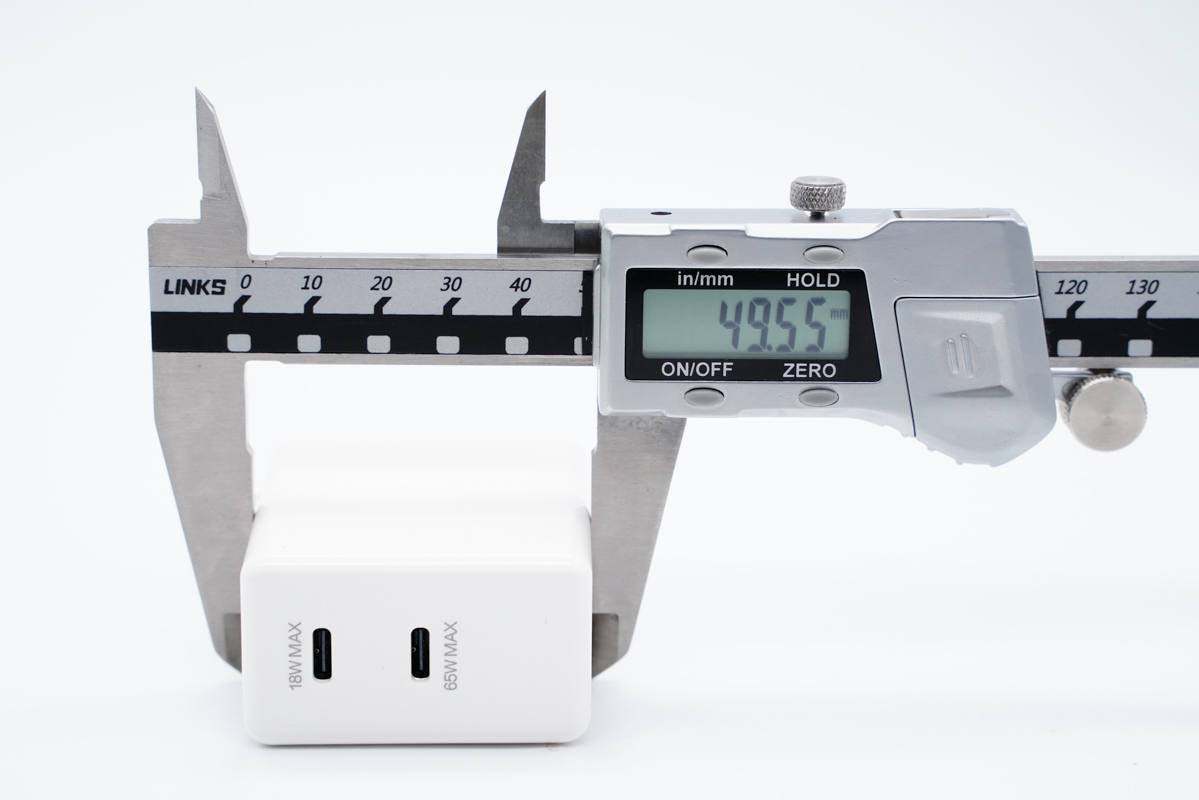 使用游標卡尺測得充電器機身高度為50.04mm。