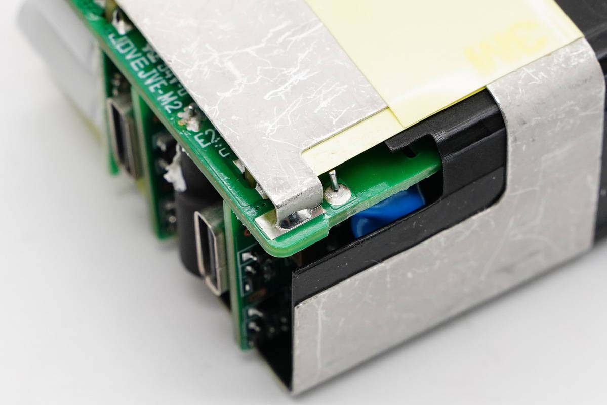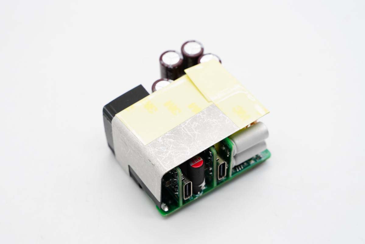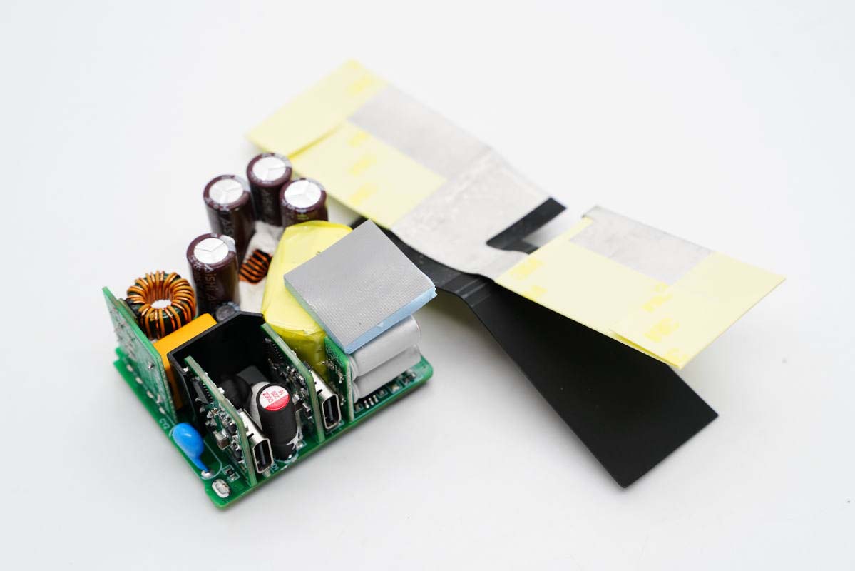 頂部、側面以及底部覆蓋大面積金屬散熱片,散熱片高壓側粘貼絕緣膠帶,此外有絕緣板進行隔離。