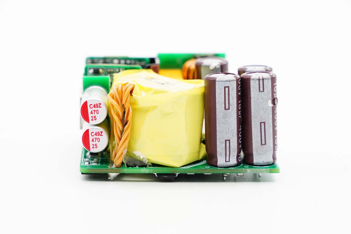 輸入端一覽,主板右側設有延時保險絲,小板上有兩顆共模電感,另一側設有四顆高壓濾波電解電容,濾波電感被擋住,打膠固定。
