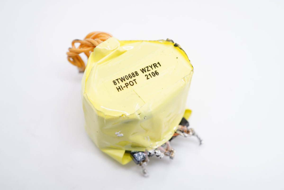 變壓器特寫,輸出采用多層絕緣線,使用絕緣膠帶嚴密包裹。