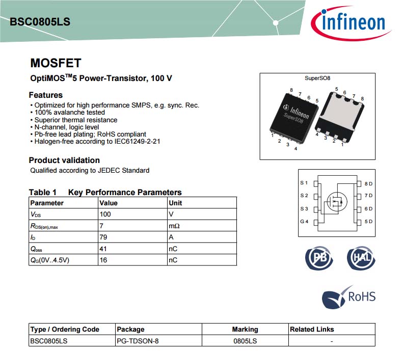 同步整流管采用英飛凌BSC0805LS,耐壓100V,導阻7mΩ,SuperSO8封裝。