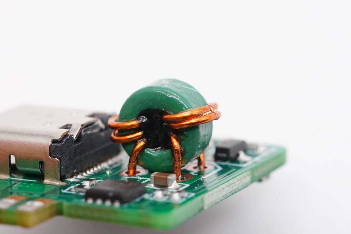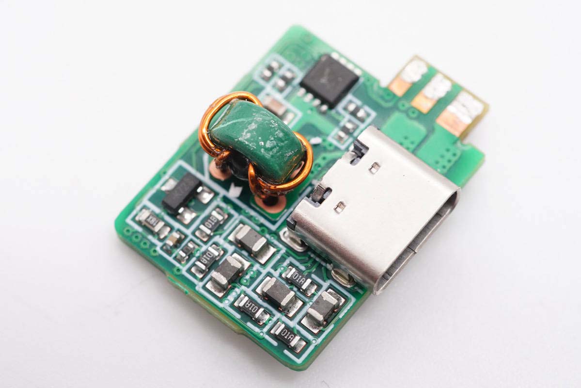 USB-C2母座所在小板正面設有濾波電感、輸出VBUS開關管。