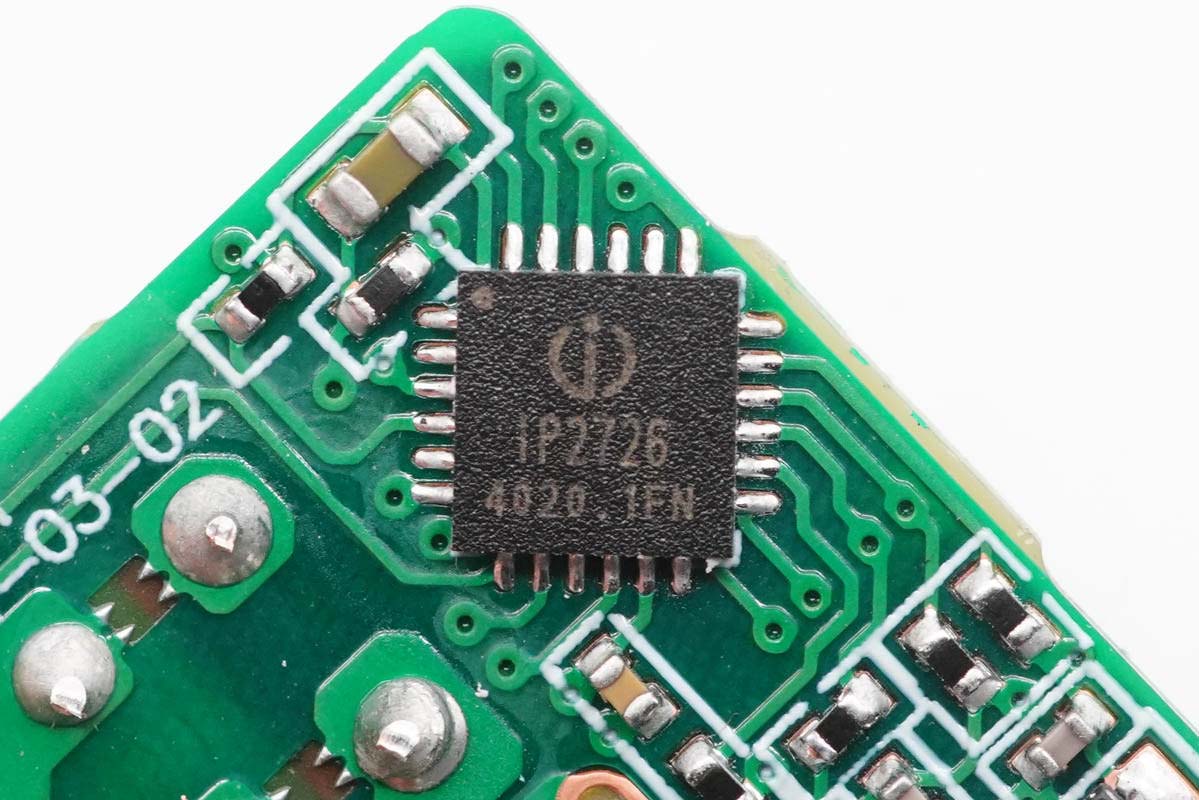 協議芯片采用英集芯IP2726,這是一顆集成多種協議、用于USB輸出端口的快充IC,支持Type-C DFP、PD2.0/3.0、PPS、QC4+、QC2.0/3.0、FCP、AFC、SCP、MTK PE+、Apple2.4A、BC1.2以及三星2A等協議。具有高集成度和豐富的功能,在應用時僅需極少的外圍器件,有效減小整體方案的尺寸,降低BOM成本。