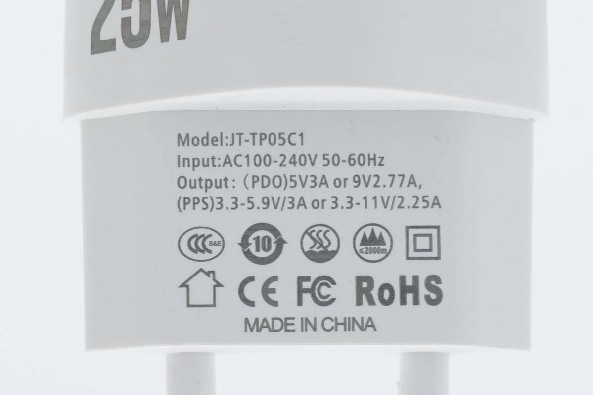 JinHotai這款25W PD快充充電器采用PC材質外殼,機身造型“敦厚”,輸入端是典型的歐規(guī)長插腳,插腳采用對角傾斜設計,使用時可使機身擺正,避免打架。充電器支持Apple 2.4A、QC、AFC、FCP、SCP、PE2.0、PD3.0、PPS快充協(xié)議,除具備5V3A、9V2.78A兩組固定電壓檔位外,還支持3.3-5.9V3A、3.3-11V2.75A兩組PPS電壓檔位,整體兼容性很好,可以滿足各大品牌手機快充需求。