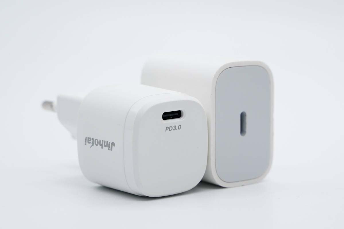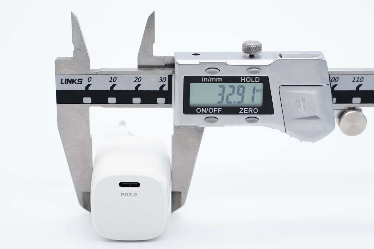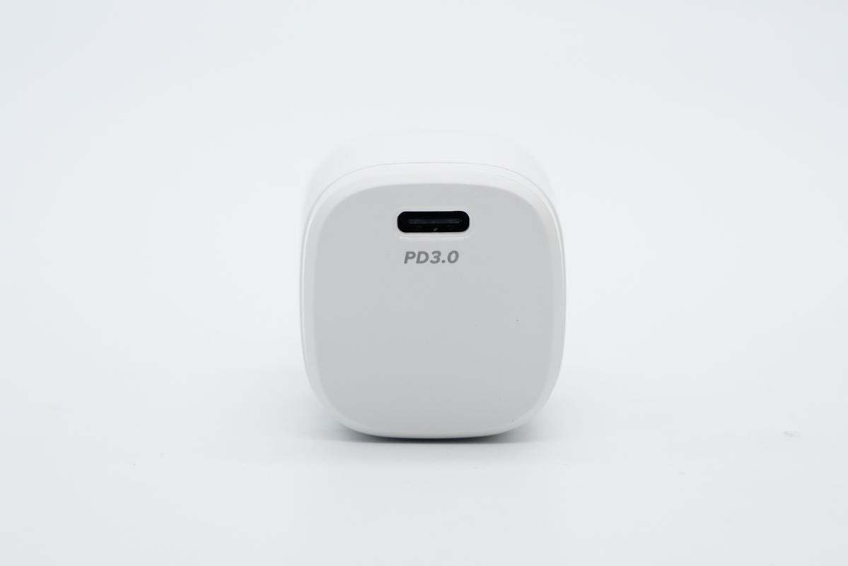和蘋果20W充電器直觀對比,機身圓潤,整體體積也較小些。