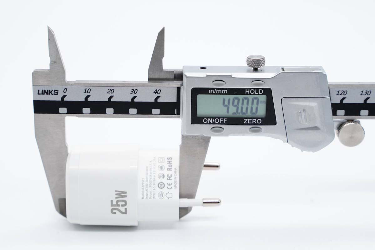 使用游標卡尺實測充電器外殼總長度為49mm。