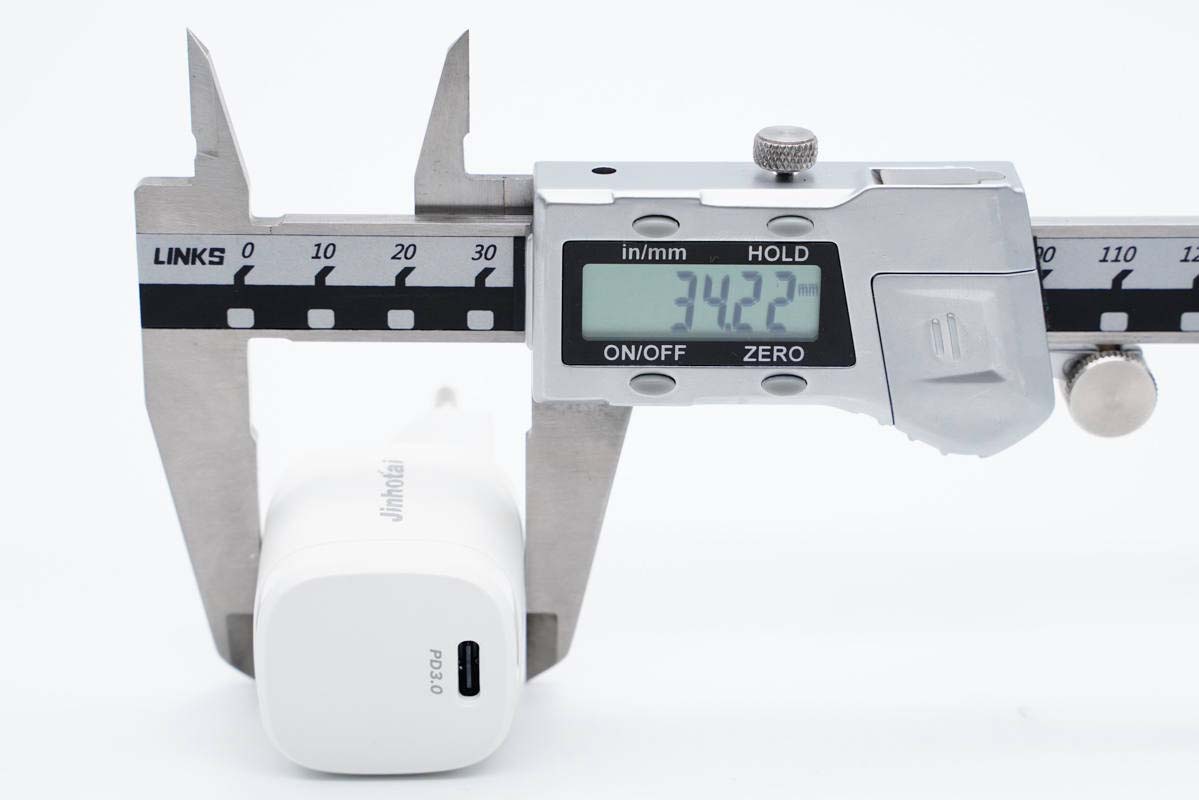 這款充電器采用PC材質白色外殼,腰身兩端亮面,中間區(qū)域啞光,其中一面印有JinHotai,輸入端采用歐規(guī)長插腳。