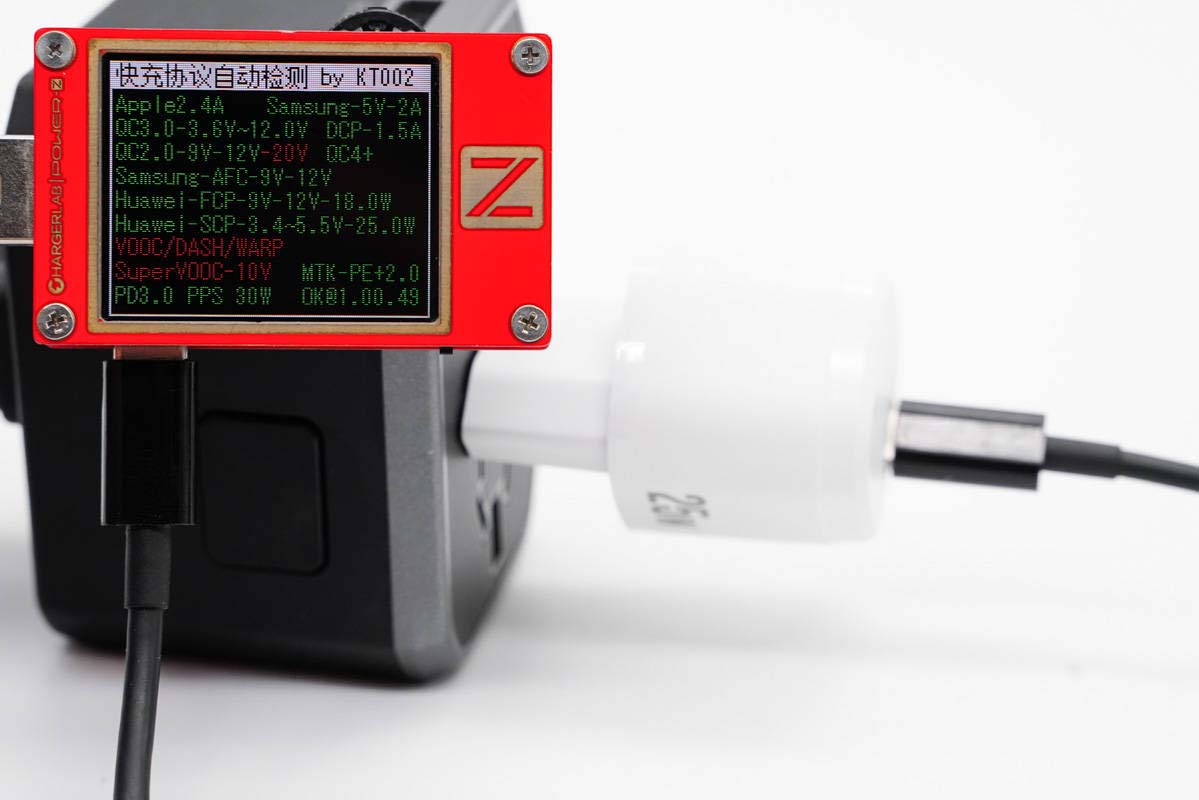 使用ChargerLAB POWER-Z KT002測得USB-C口支持Apple 2.4A、Samsung 5V2A、DCP協(xié)議,以及QC2.0/3.0、AFC、FCP、SCP、PE2.0、PD3.0、PPS快充協(xié)議。