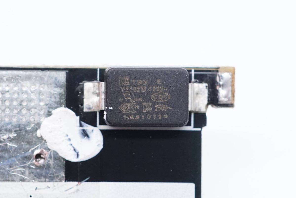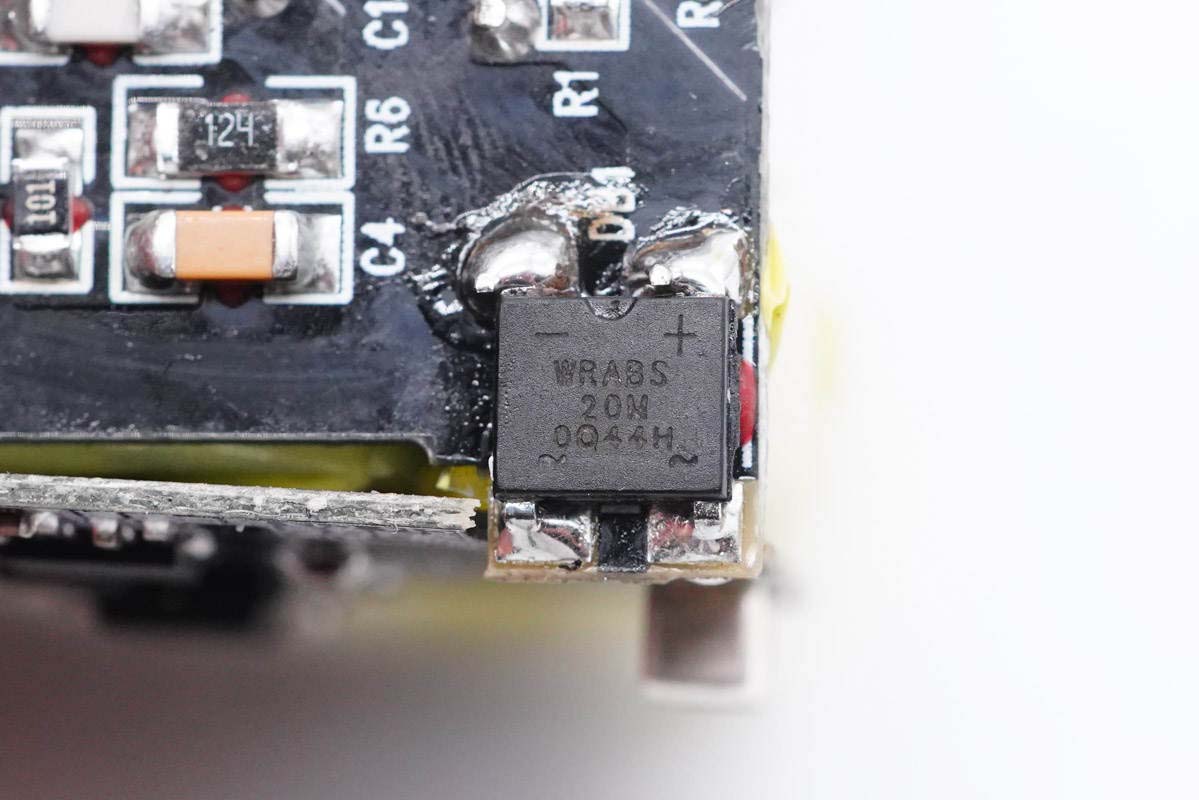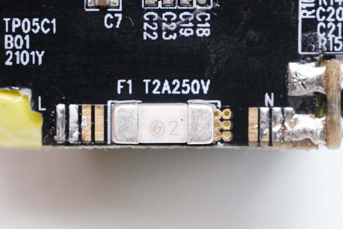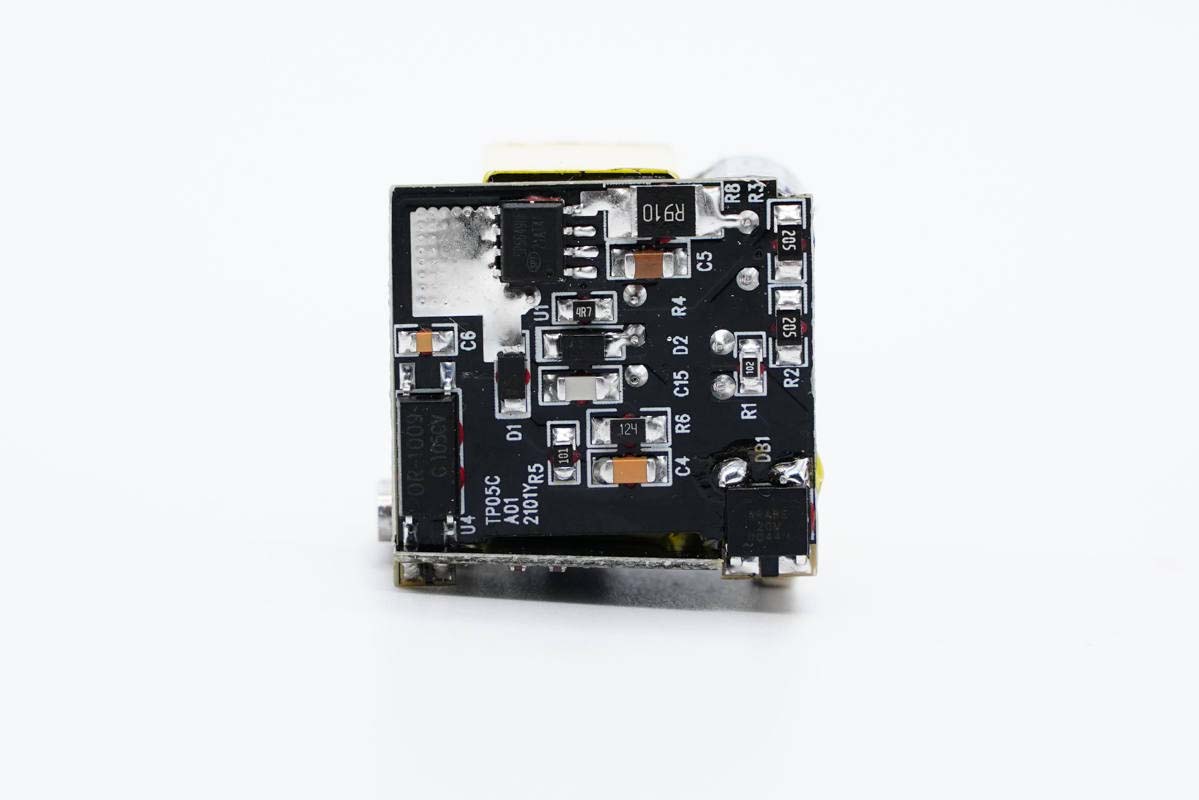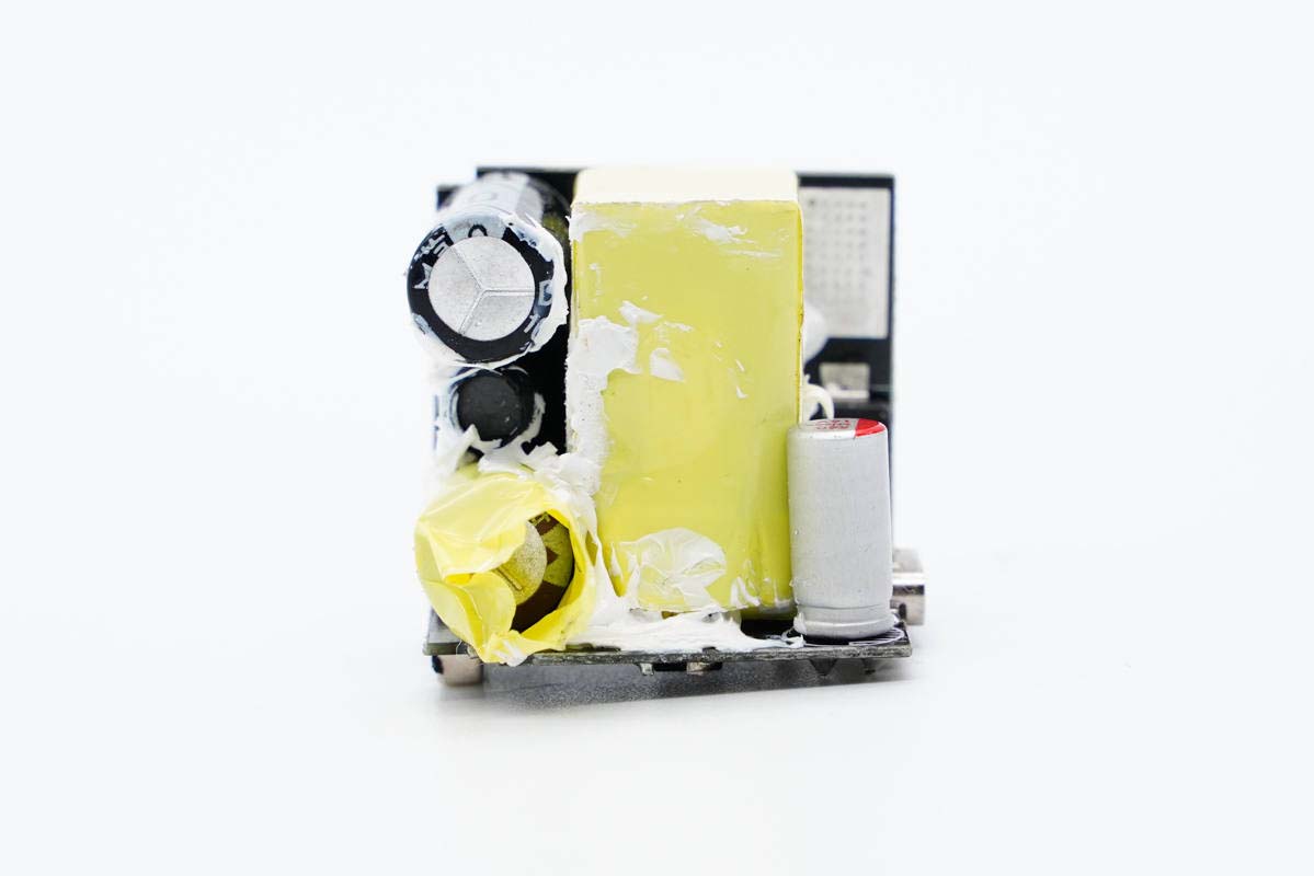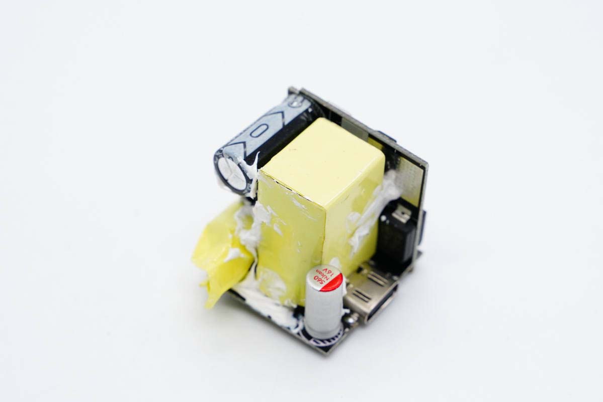 從另一側看去,正面設有工字電感、兩顆高壓濾波電解電容、變壓器和貼片Y電容,其中一顆電容包裹絕緣膠帶。