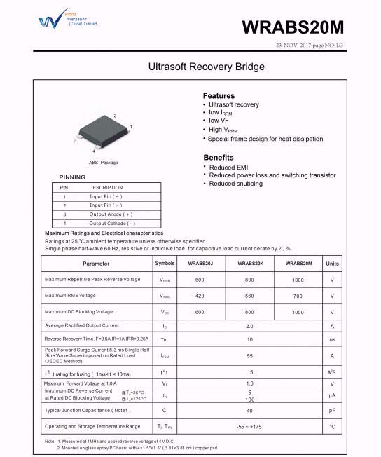 整流橋采用深圳市沃爾德實業(yè)有限公司的WRABS20M。這顆軟橋通過較軟的恢復曲線,比較平滑的關斷特性,可以降低二極管結電容達到非常少的諧波振蕩產生的效果。