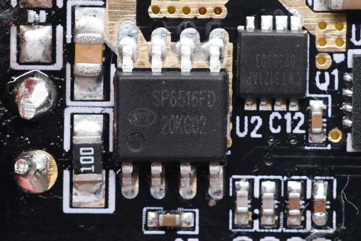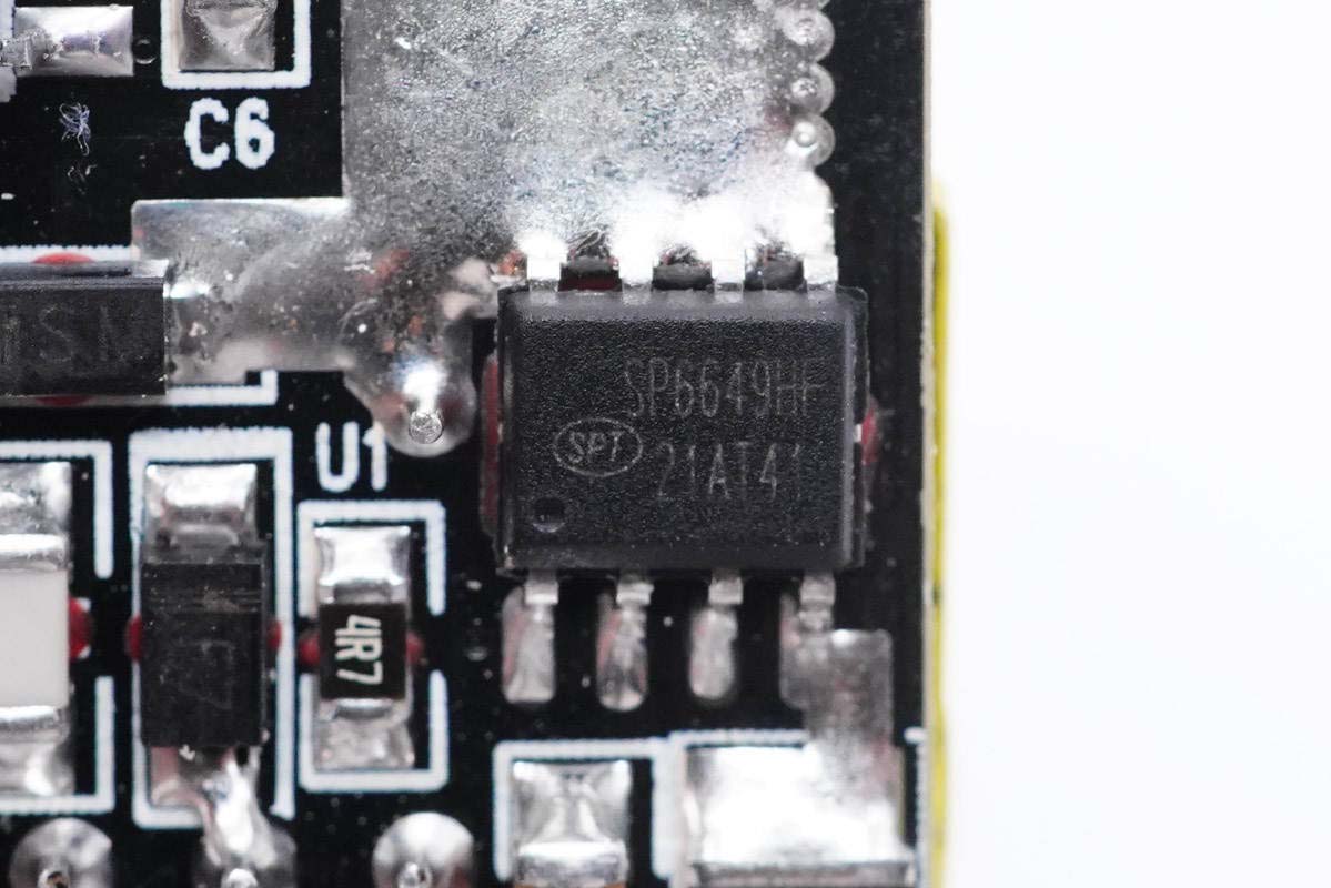 充電頭網(wǎng)通過拆解了解到,充電器采用兩塊PCB板垂直焊接,L型結構設計。采用了硅動力SP6649HF+SP6516F高集成快充方案,幫助充電器實現(xiàn)小型化。另外采用智融SW2303控制輸出電壓,該芯片是業(yè)內首顆非MCU架構的QC5認證協(xié)議芯片,性能強悍,充電器支持如此齊全的快充協(xié)議正是得益于它。