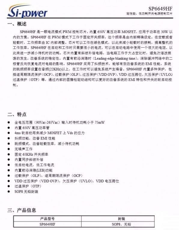 開關電源主控芯片采用硅動力SP6649HF,這是一顆電流模式PWM控制芯片,內置650V高壓功率MOSFET,應用于功率在30W以內的方案,固定65KHz開關頻率,內置抖頻功能用于改善EMI性能,跳頻模式提高輕載效率,降低待機功耗。同時內置多種完善的保護功能,全功率范圍無音頻噪聲,采用SOP8封裝。