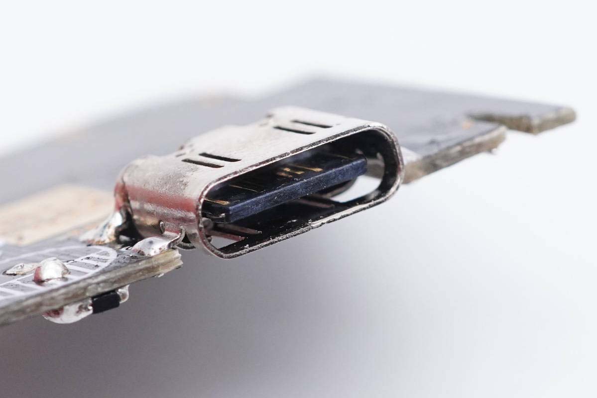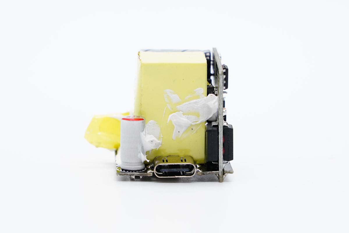 主板背面設有保險絲、同步整流芯片、協(xié)議芯片以及輸出VBUS開關管,初次級分界明顯,USB-C母座沉板設計。