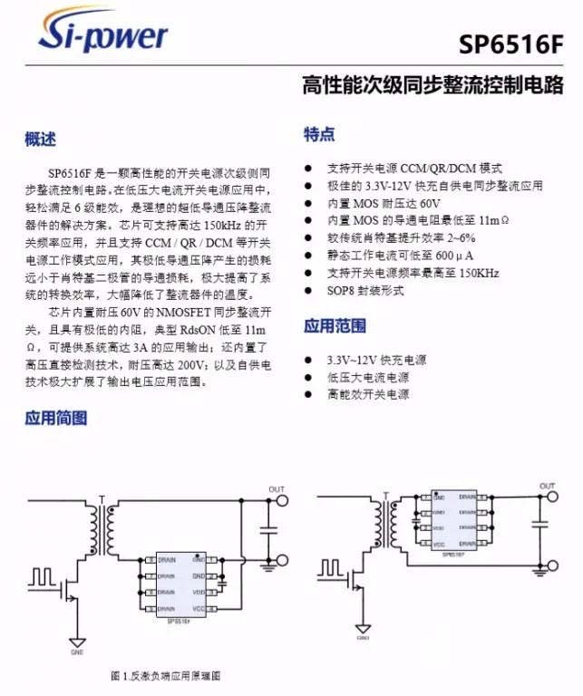 和PWM主控芯片搭配的是硅動力SP6516F次級同步整流芯片,內置耐壓60V的NMOSFET同步整流開關,且具有極低的內阻,典型RdsON低至11mΩ,可提供系統(tǒng)高達3A的應用輸出,工作電壓范圍寬,支持多種工作模式,應用方便。