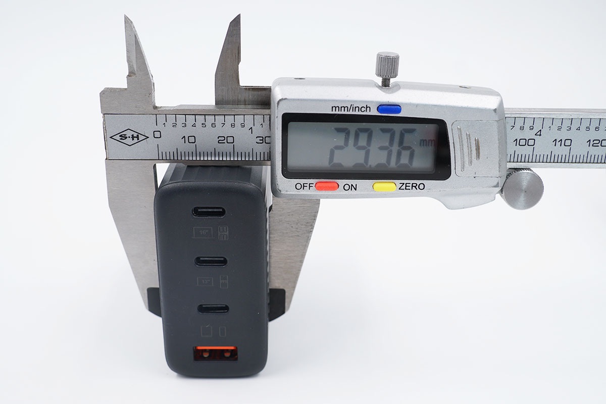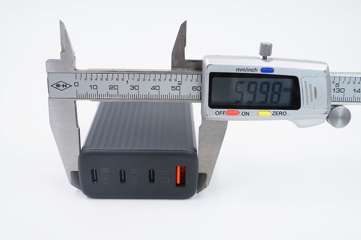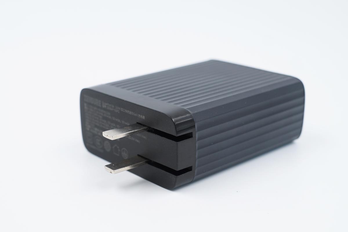 充電器的三維參數(shù)為75.7x59.98x29.36mm,可計算體積約為133.30cm3,這個體積大小在目前市面上同類100W氮化鎵充電器中算是比較小的了,排在前列。以最高輸出100W計算,功率密度約為0.75W/cm3 。