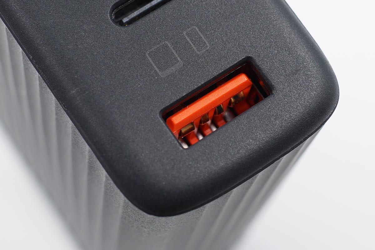 USB-A接口的內(nèi)部為橙色膠芯,內(nèi)部四個彈片中兩側(cè)彈片加寬設(shè)計,這也是很熟悉的設(shè)計了。需要說明的是此次充電頭網(wǎng)拿到的為試產(chǎn)版本,正式版USB-A接口的內(nèi)部為綠色膠芯,最終以官方發(fā)布的為準。