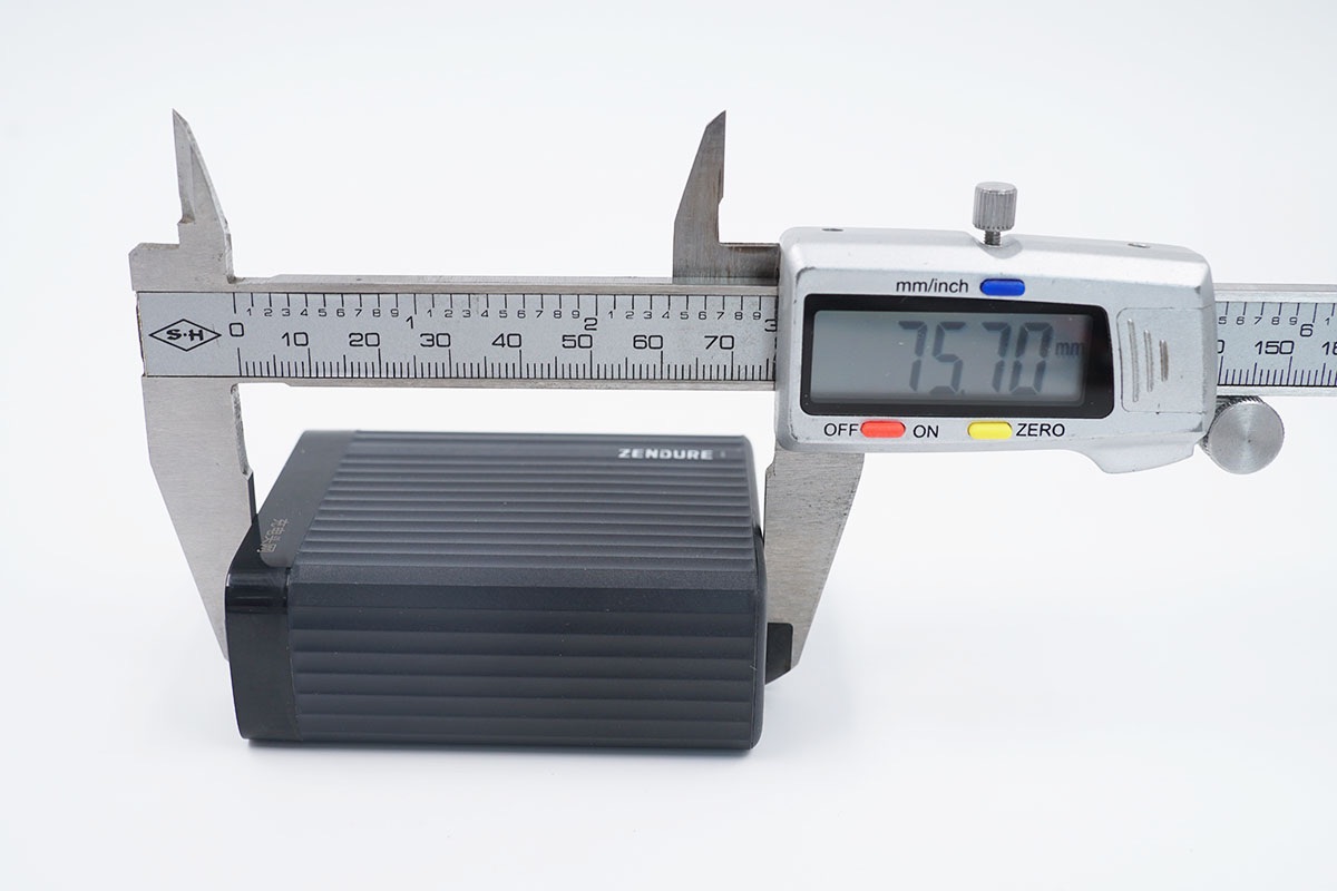 使用卡尺實測充電器的長度約為75.7mm。