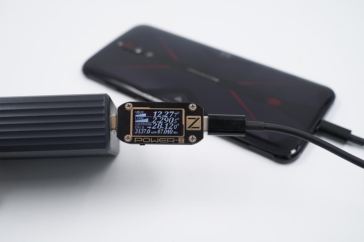 努比亞紅魔5G手機支持PPS/QC/USB PD快充協(xié)議,使用USB-C1為努比亞紅魔5G手機充電,功率為12.27V 2.29A 28.12W。