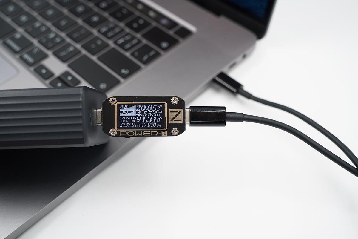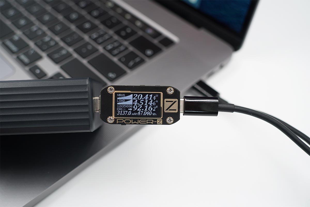 MacBook Pro 16支持USB PD快充協(xié)議,使用USB-C2為MacBook Pro 16充電,功率20.05V 4.55A 91.31W。