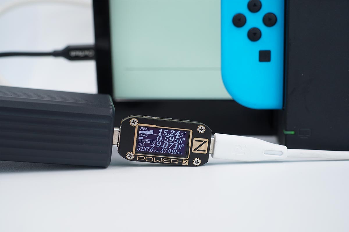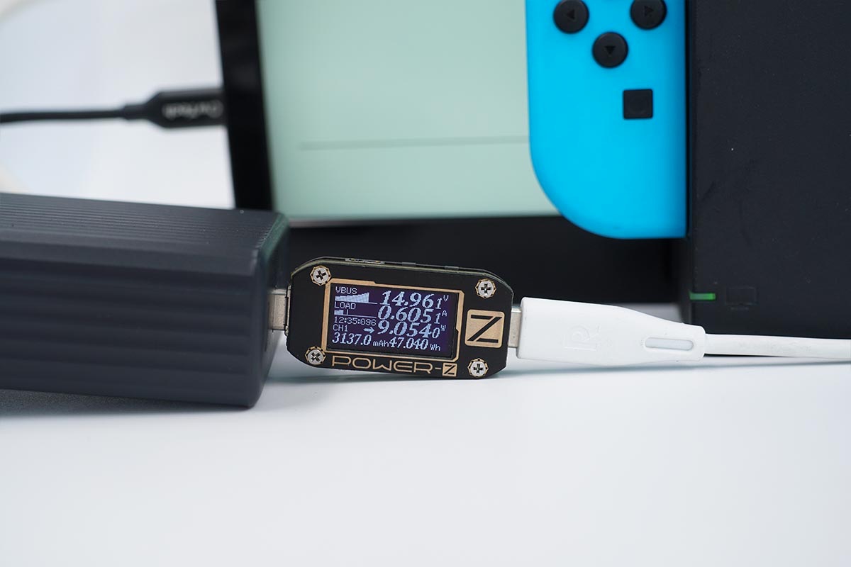 Switch帶有特殊的底座TV模式,需要15V3A PDO才可以正常工作,非常挑充電設(shè)備。使用USB-C1為Switch底座供電,功率為15.24V 0.59A 9.07W,成功握手底座TV模式,底座正常對顯示屏輸出HDMI信號。