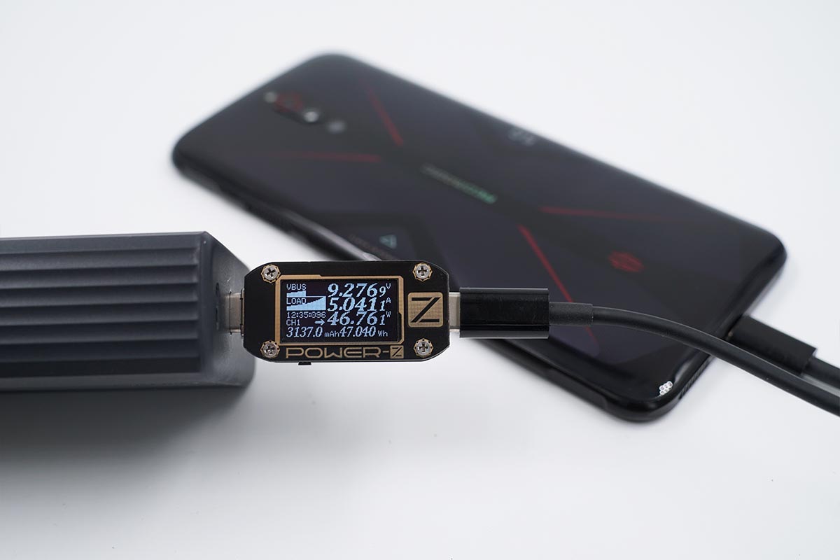 努比亞紅魔5G手機支持PPS/QC/USB PD快充協(xié)議,使用USB-C2為努比亞紅魔5G手機充電,功率為9.27V 5.04A 46.76W。