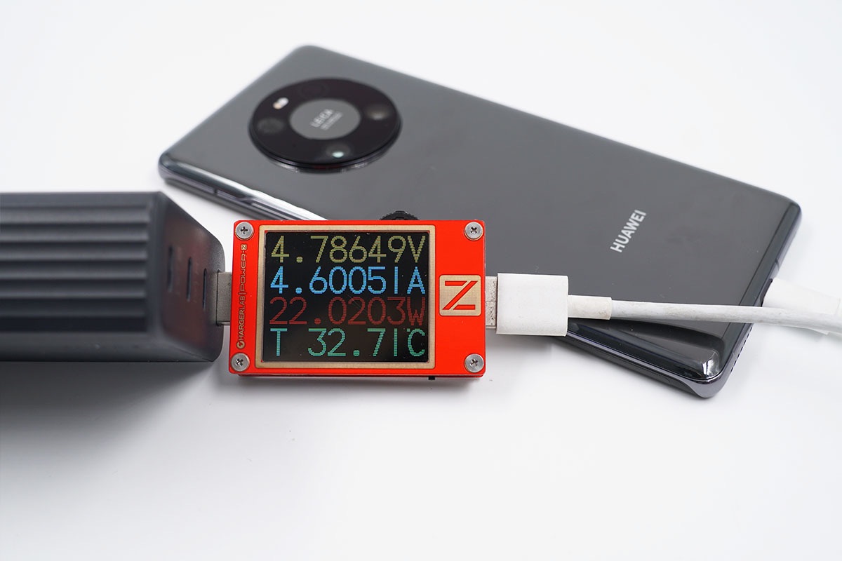 華為Mate40 Pro支持SCP/FCP/PD快充協(xié)議,使用USB-A為華為Mate40 Pro充電,功率為4.78V 4.60A 22.02W。