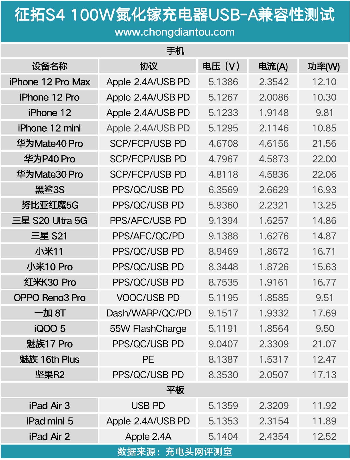 將USB-A的測試數(shù)據(jù)匯總成表,對于華為手機可以觸發(fā)22.5W SCP快充,對于其他的設(shè)備基本都可以觸發(fā)相應(yīng)的快充。