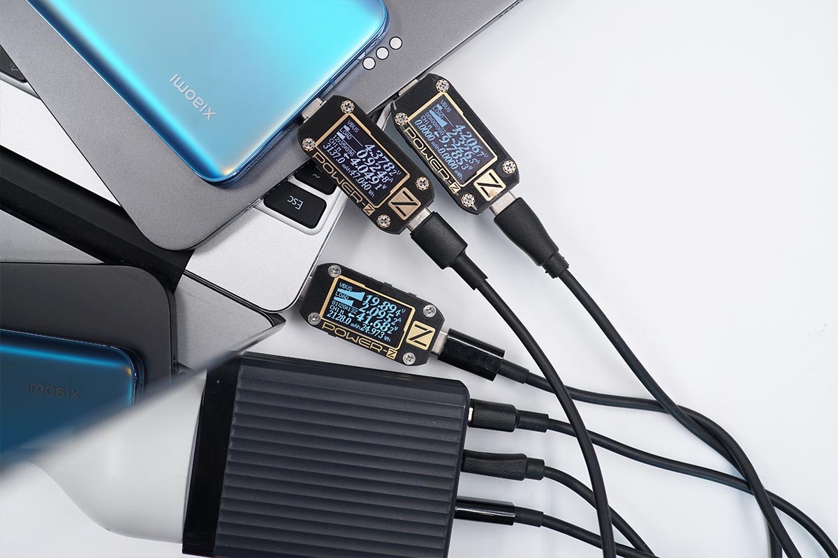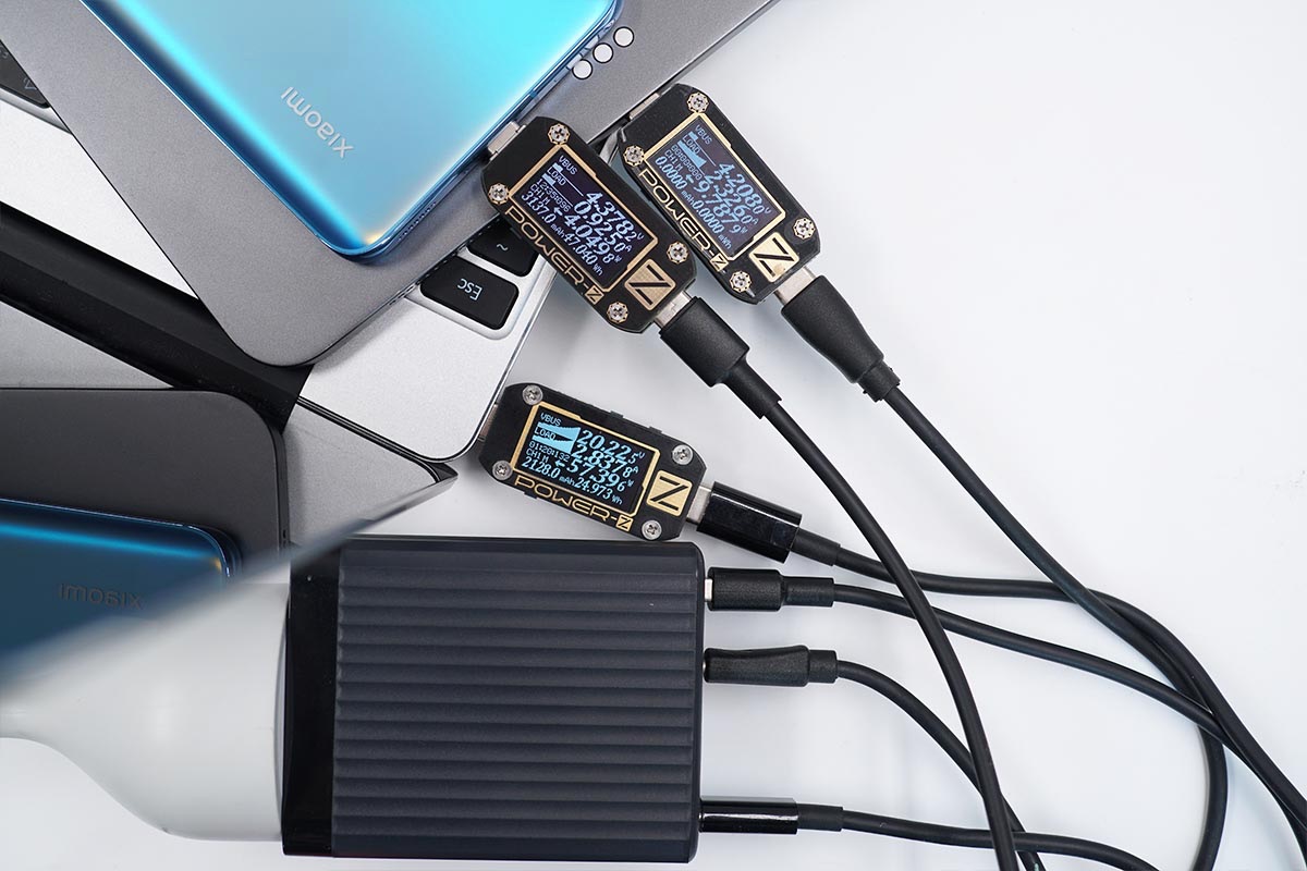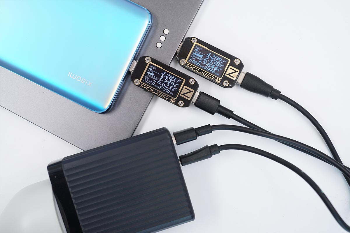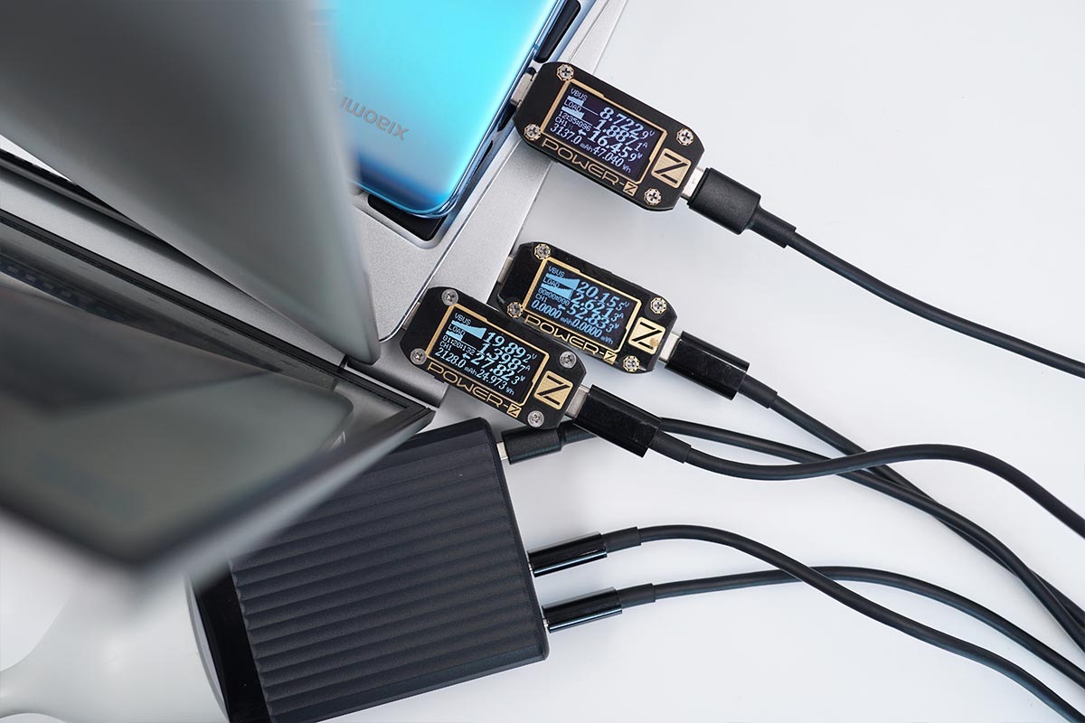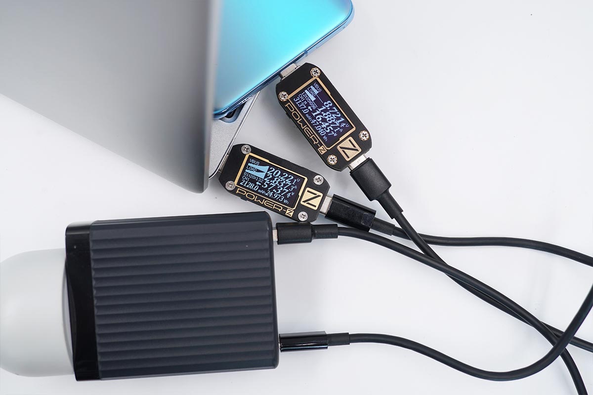 使用USB-C1和USB-C2同時為筆電充電,功率分別為52.83W,27.82W;同時使用USB-A為手機充電,功率為16.45W。充電器支持USB-C1、USB-C2和USB-A同時輸出,功率分配為60W+30W+18W。