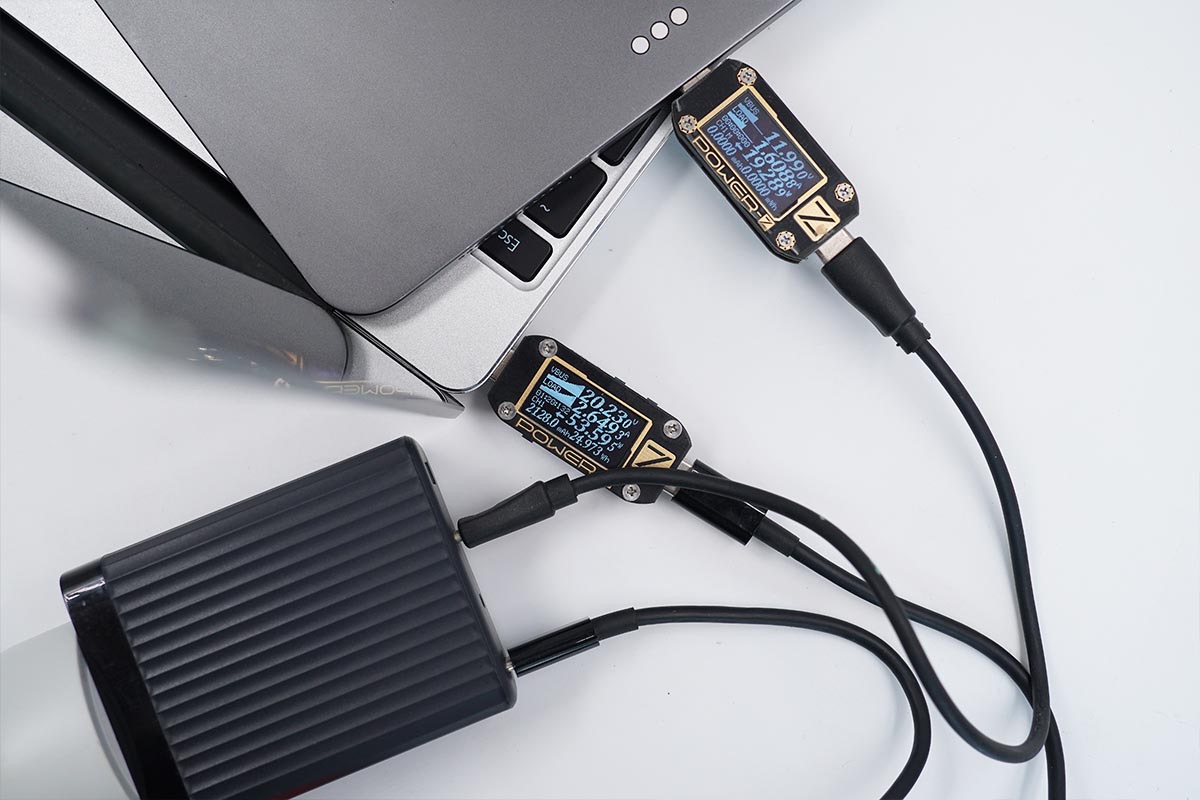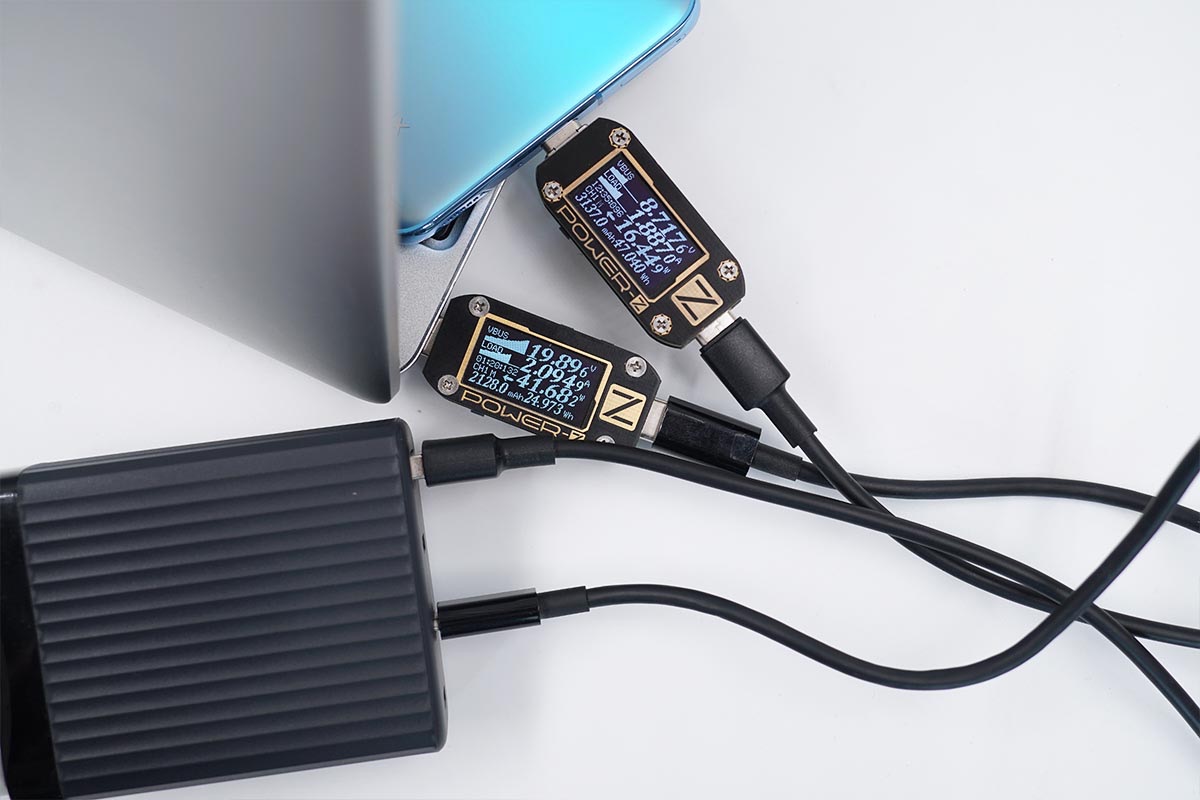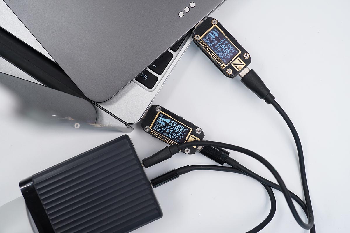 使用USB-C1為筆電充電,功率為52.31W;同時使用USB-C2為筆電充電,功率為41.67W。充電器支持USB-C1和USB-C2同時輸出,功率分配為60W+45W。