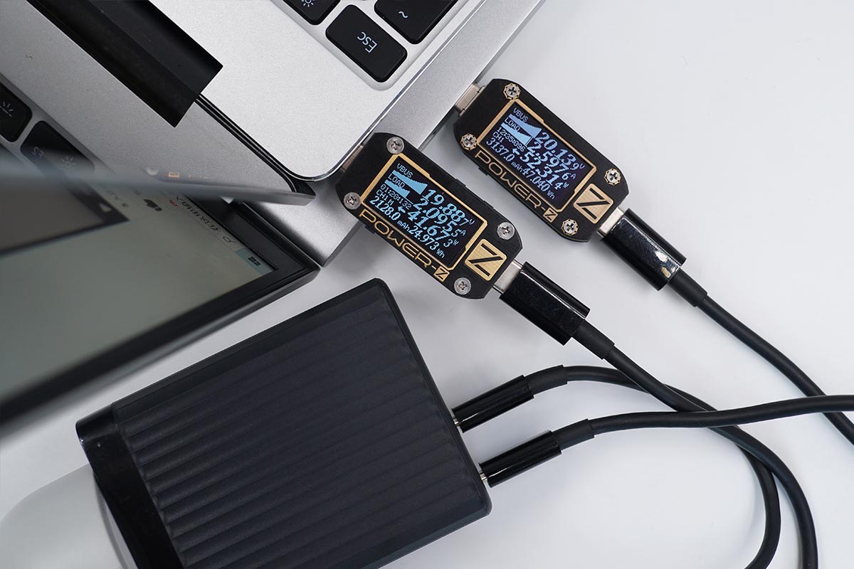 使用USB-C2為筆電充電,功率為41.67W;同時使用USB-C3為iPad充電,功率為19.26W。充電器支持USB-C2和USB-C3同時輸出,功率分配為45W+20W。