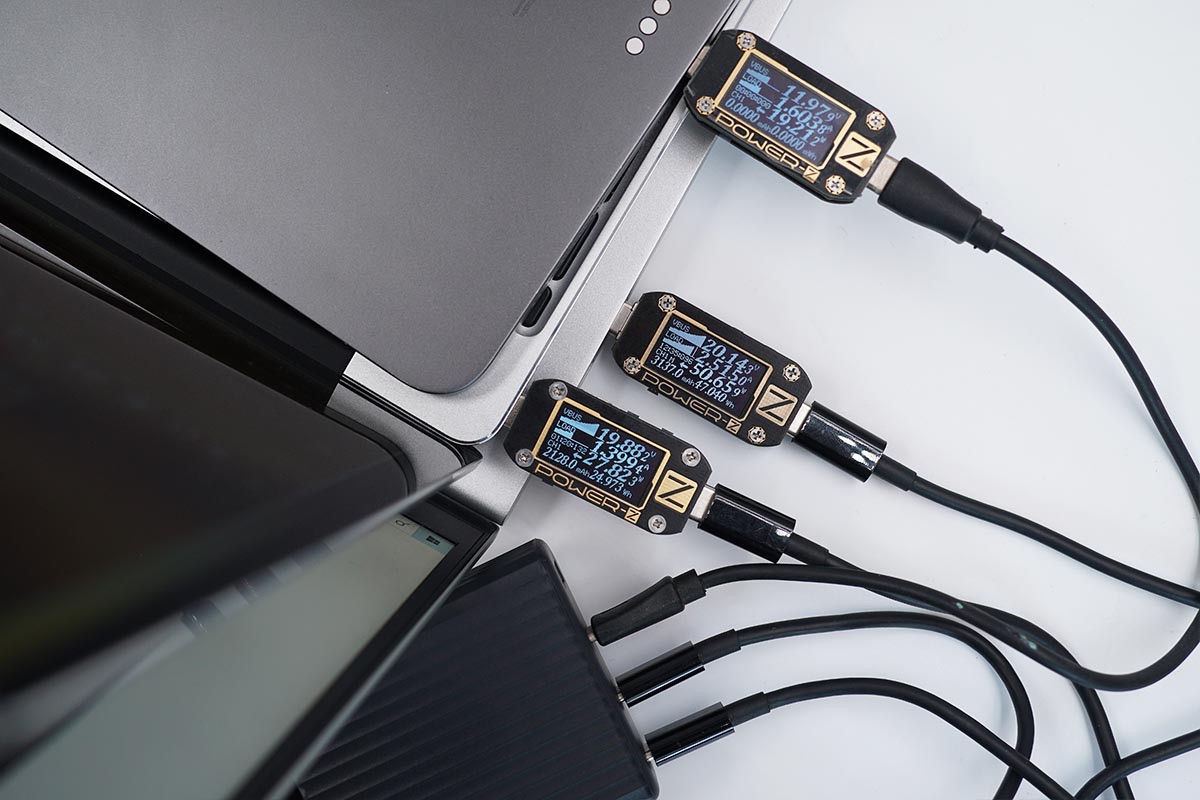使用USB-C1為筆電充電,功率為53.59W;同時使用USB-C3為iPad充電,功率為19.28W。充電器支持USB-C1和USB-C3同時輸出,功率分配為60W+20W。