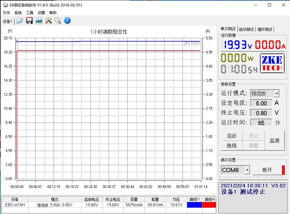 按照額定功率20V 5A 100W滿載對充電器進行穩(wěn)定性測試,測試時間為一小時,測試過程中電壓值呈水平直線,無明顯波動情況,長時間滿載比較穩(wěn)定。